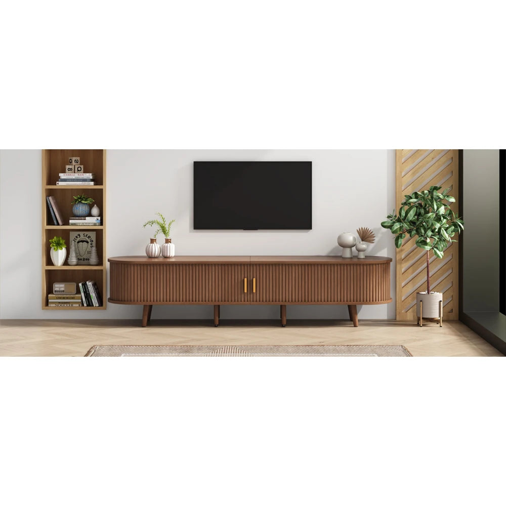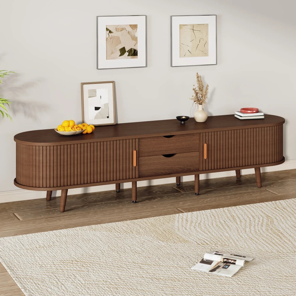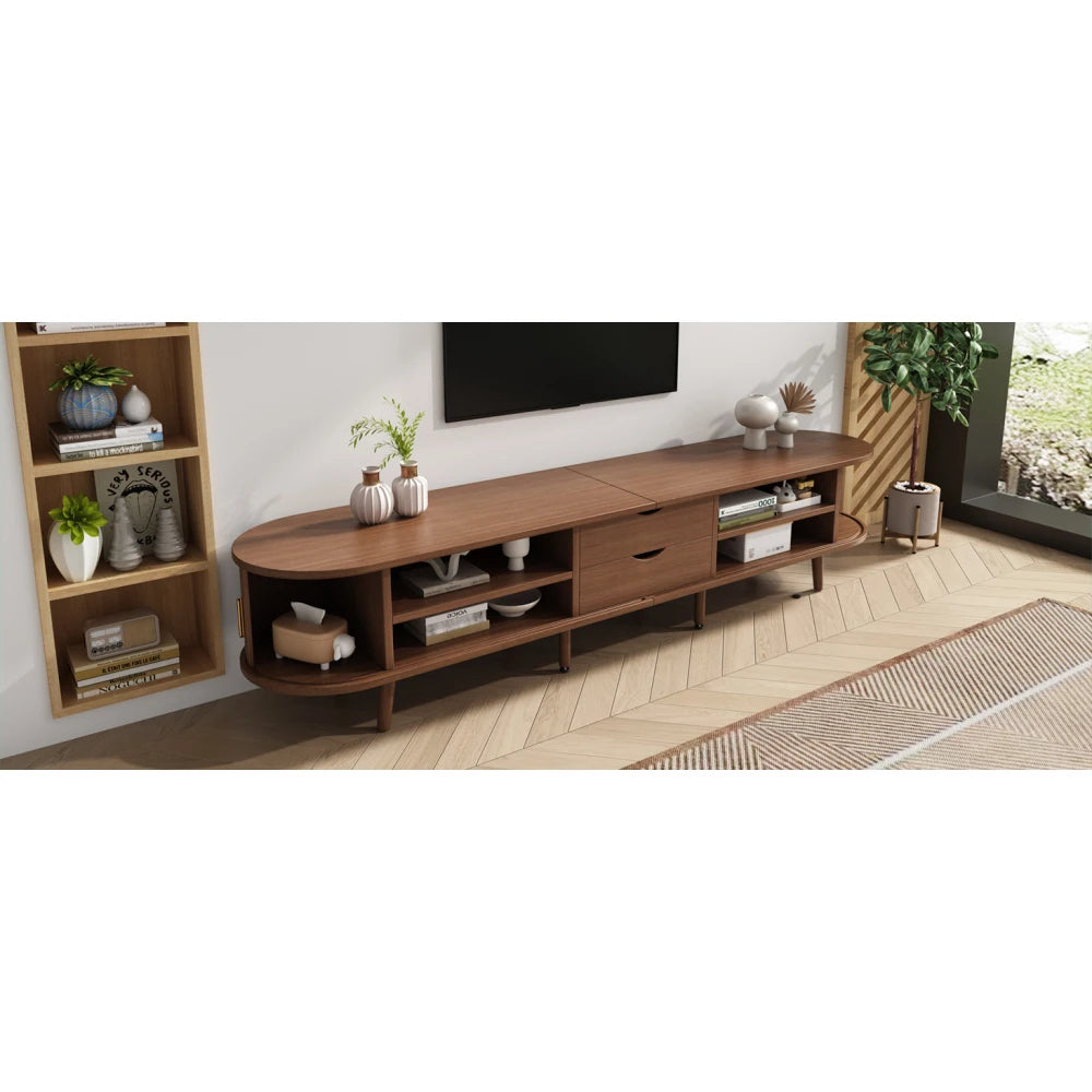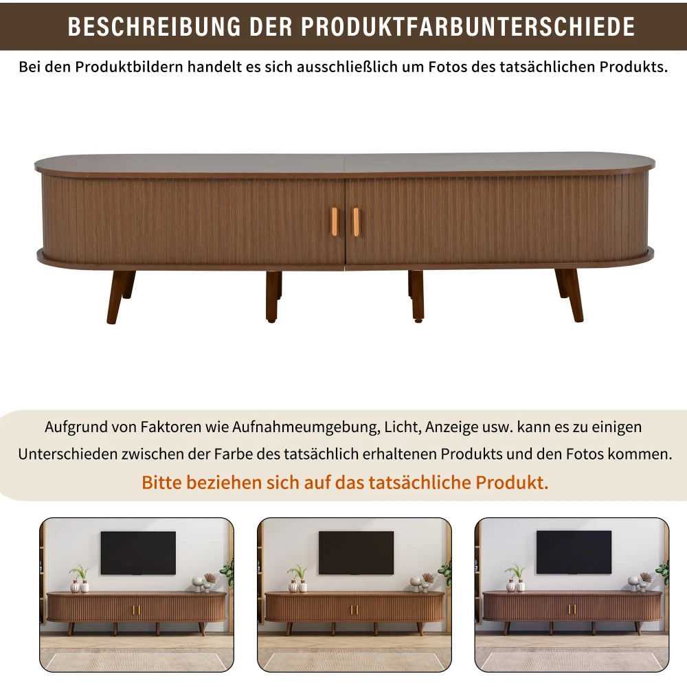 Ge ditt vardagsrum en stilren och funktionell uppgradering med denna eleganta TV-bänk i matt valnöt. Med sin ovala form, smarta förvaringslösningar och justerbara ben kombinerar den design, stabilitet och praktisk användning – perfekt för moderna hem och mindre ytor.