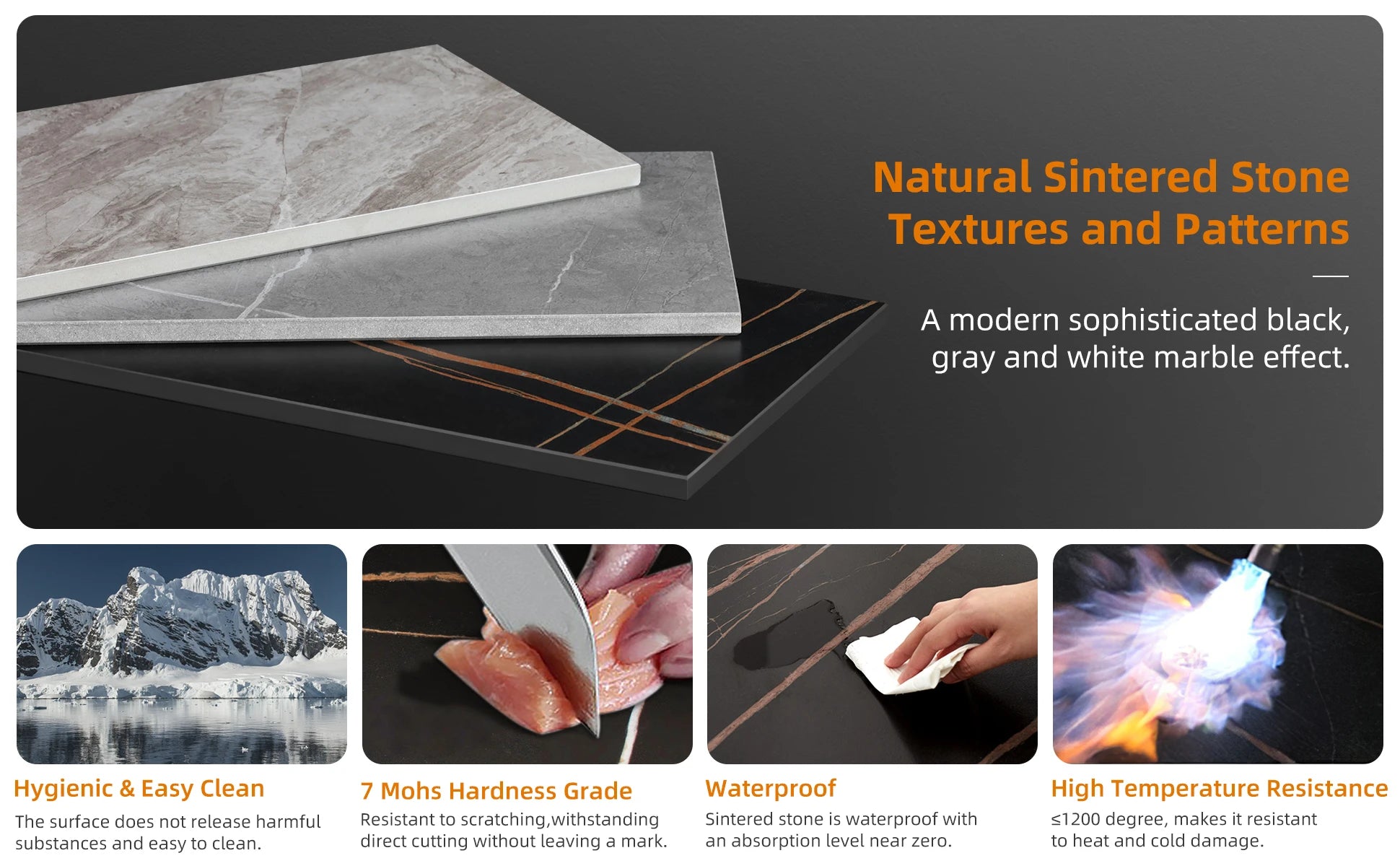 🪨 Sintrad stenbordsskiva: Mer hållbar än äkta marmor – reptålig, värmetålig upp till 1200 °C och lätt att rengöra.