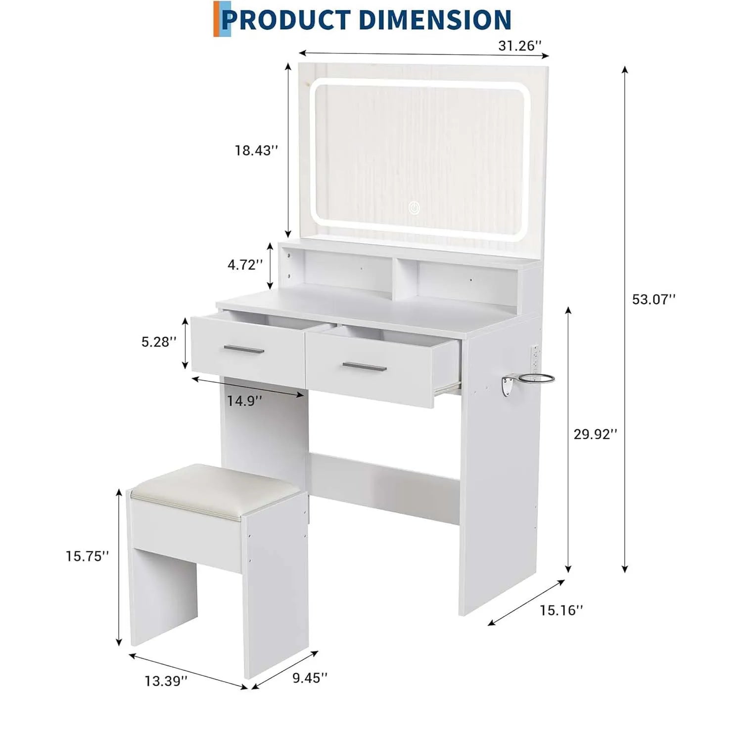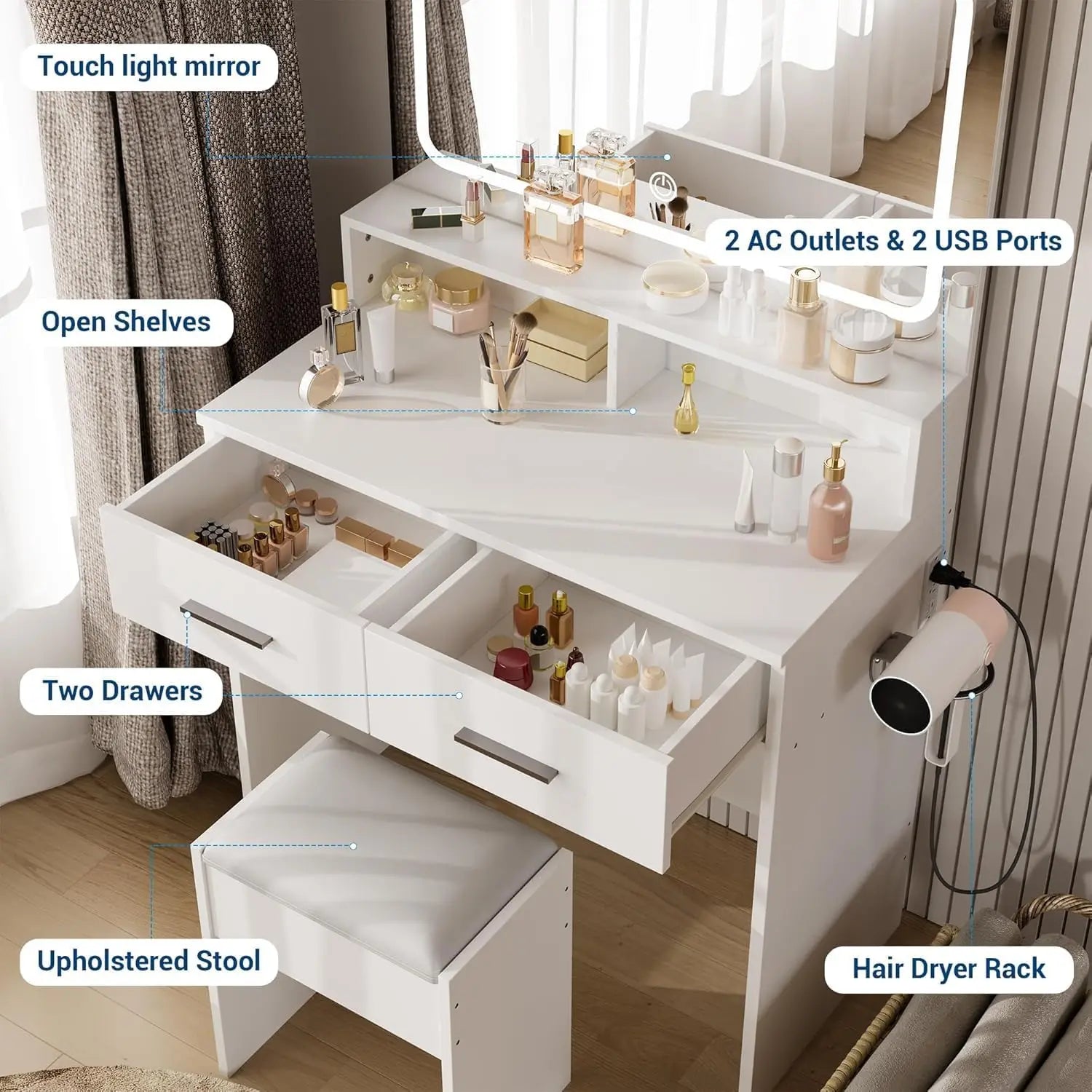 Sminkbord med LED-spegel & Eluttag – Komplett Set med Pall & Hårfönhållare