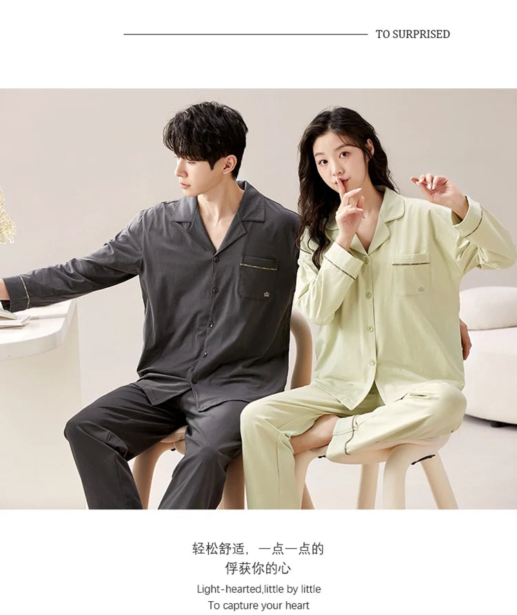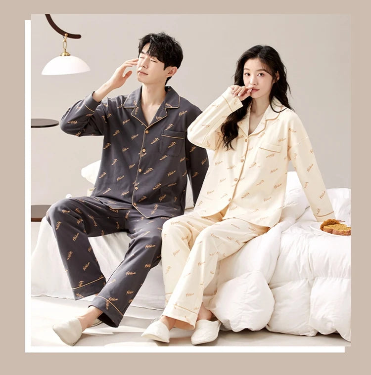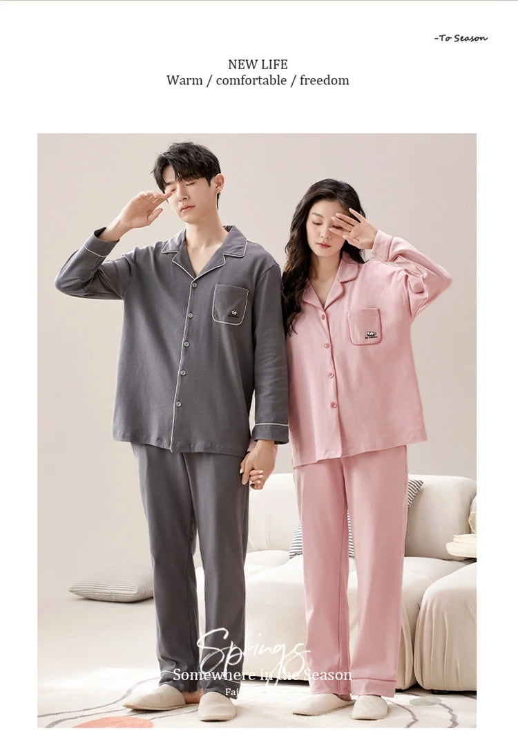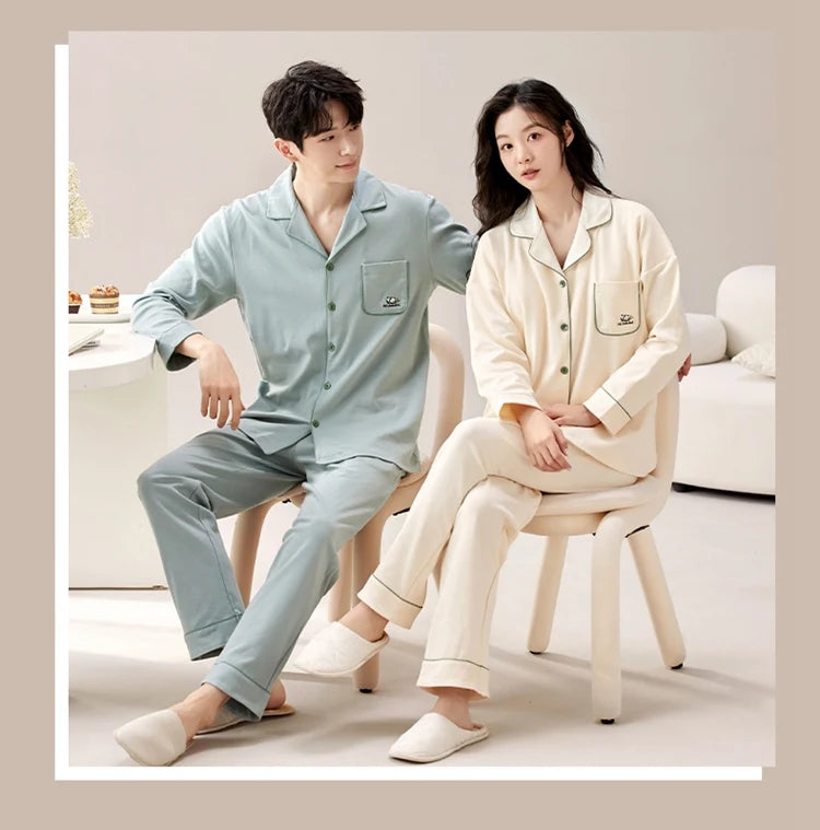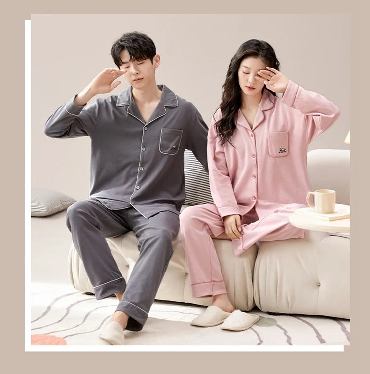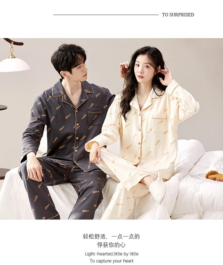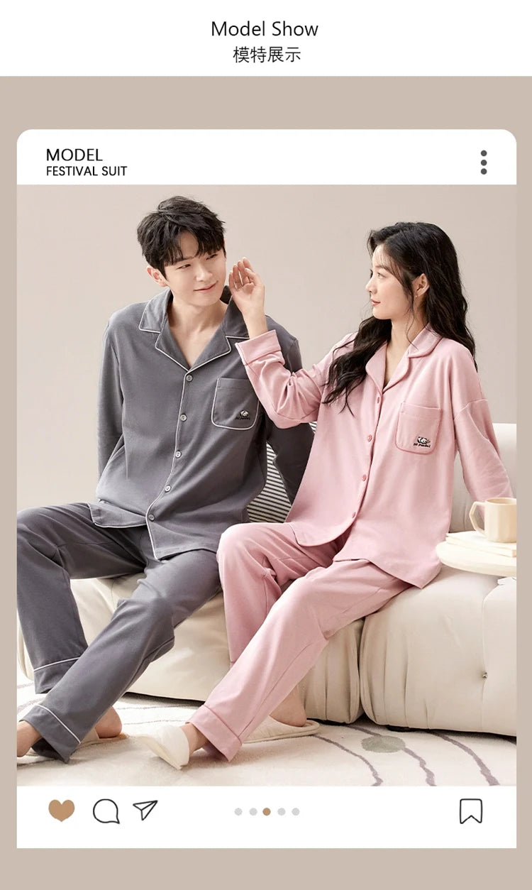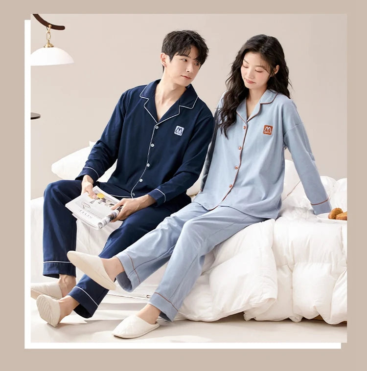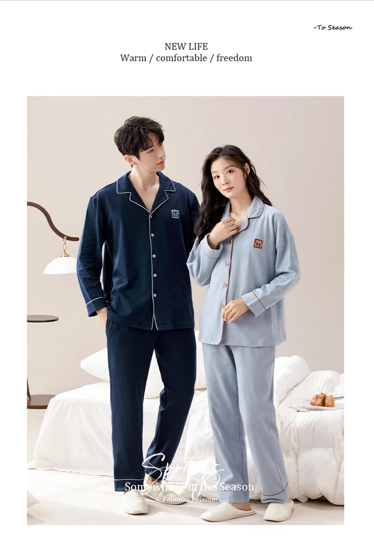 Matchande pyjamas för par med mjuk stickad bomull – perfekt för mysiga kvällar hemma under höst och vinter.