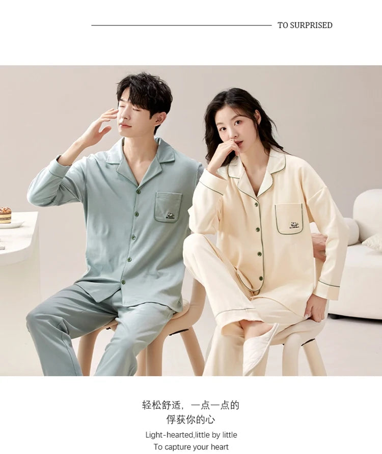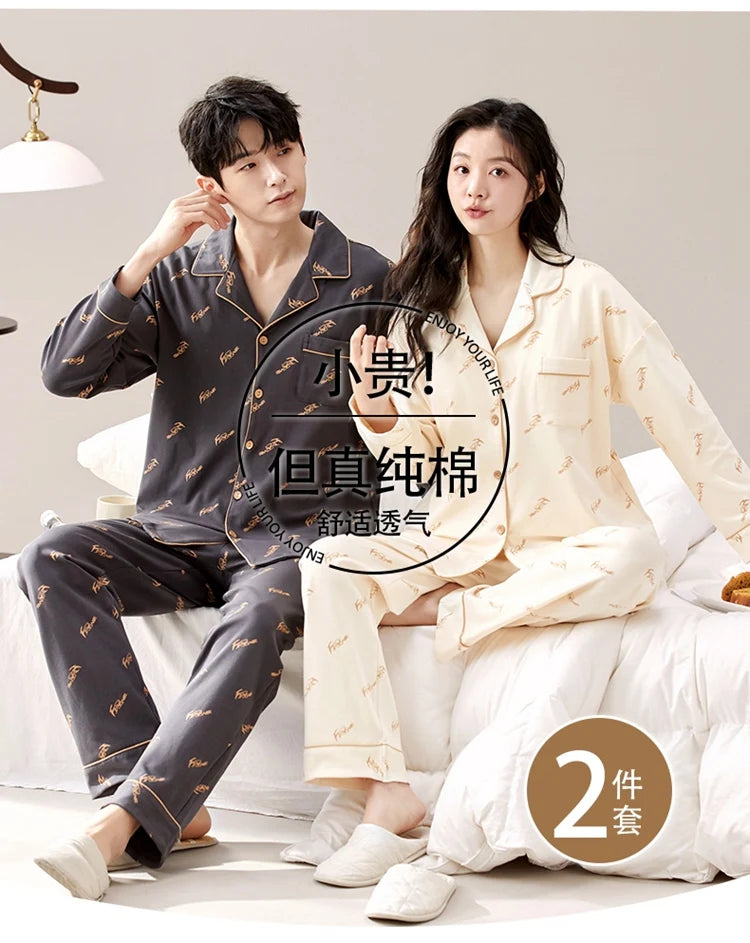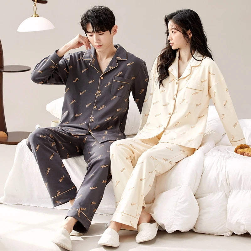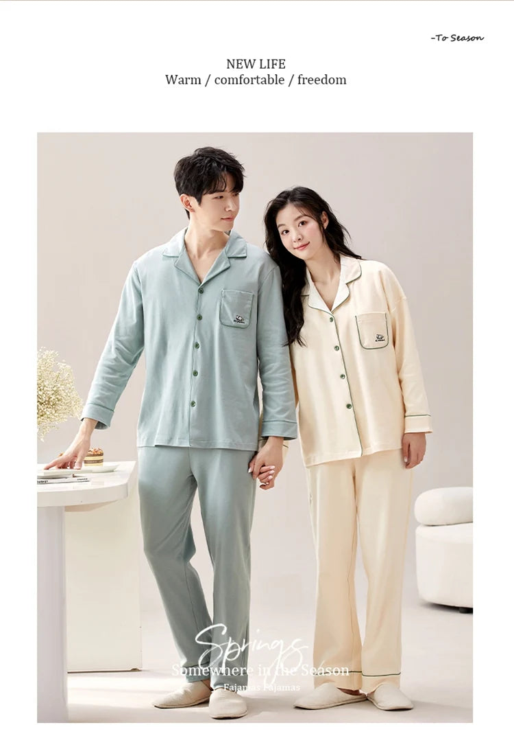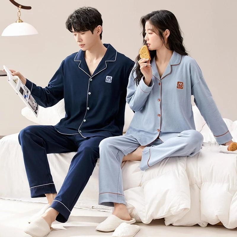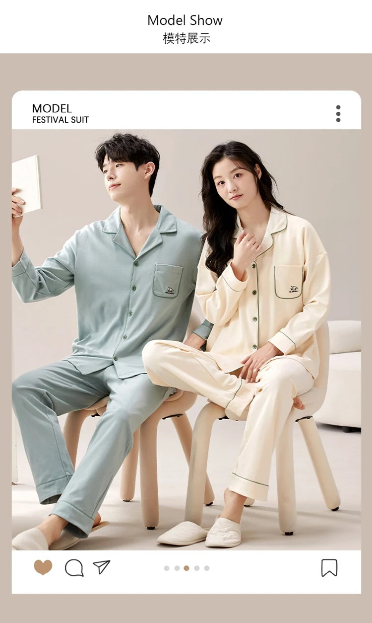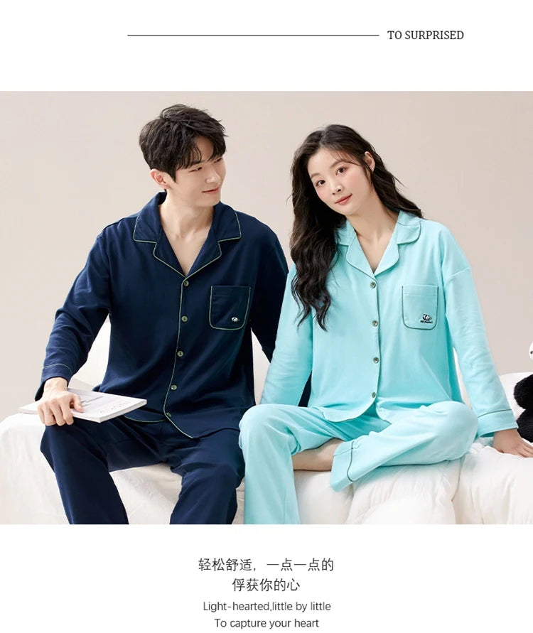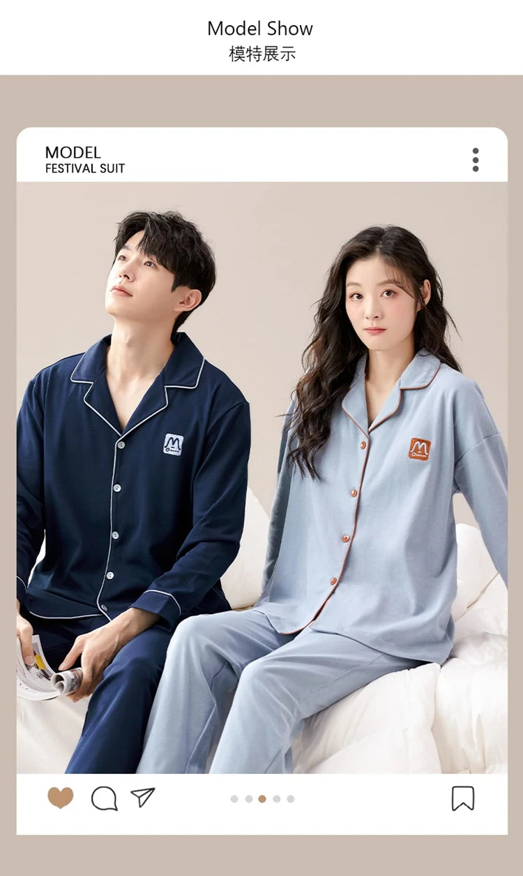 Matchande pyjamas för par med mjuk stickad bomull – perfekt för mysiga kvällar hemma under höst och vinter.