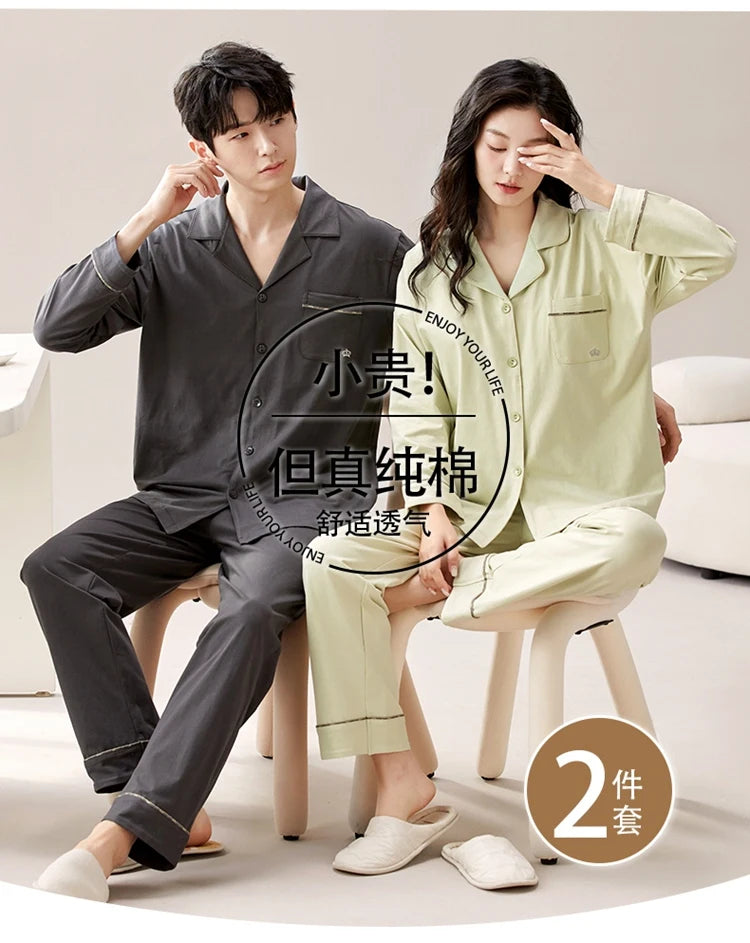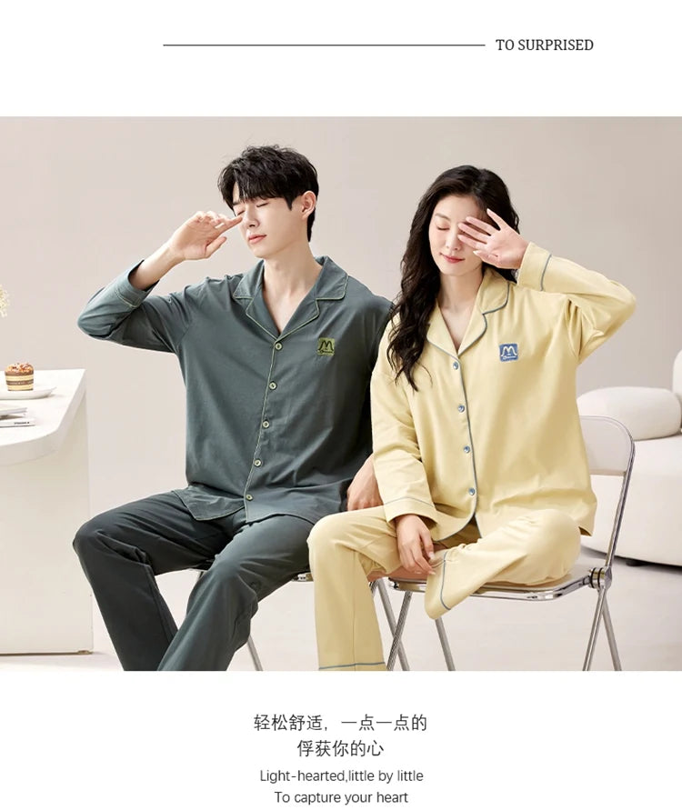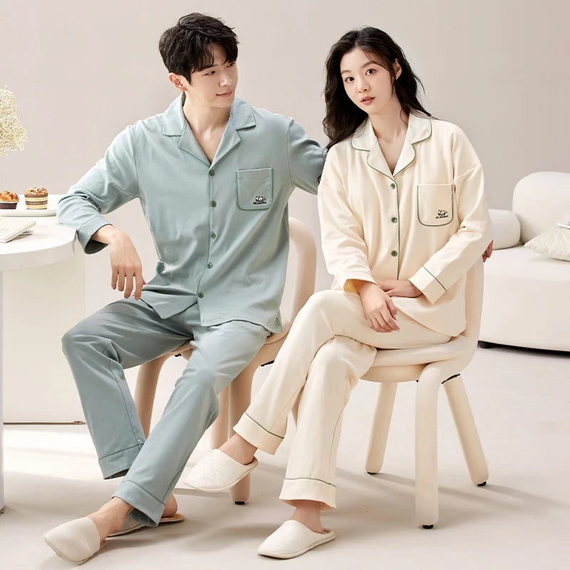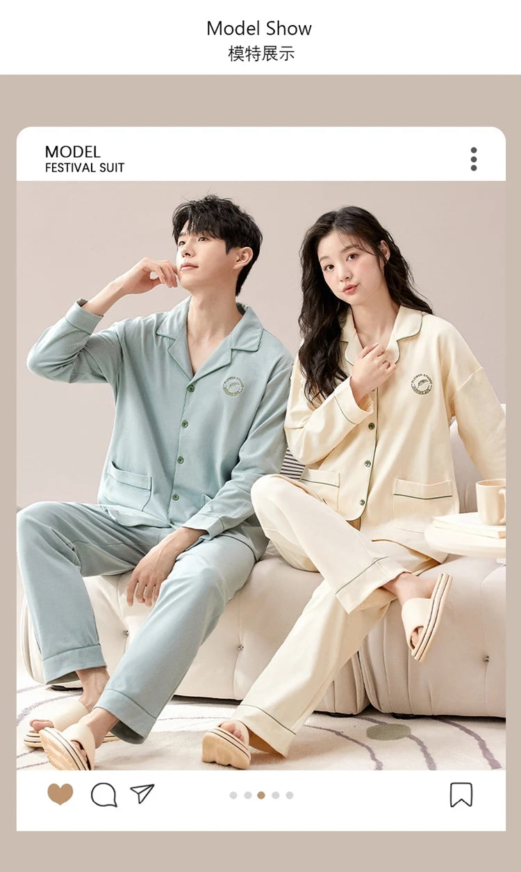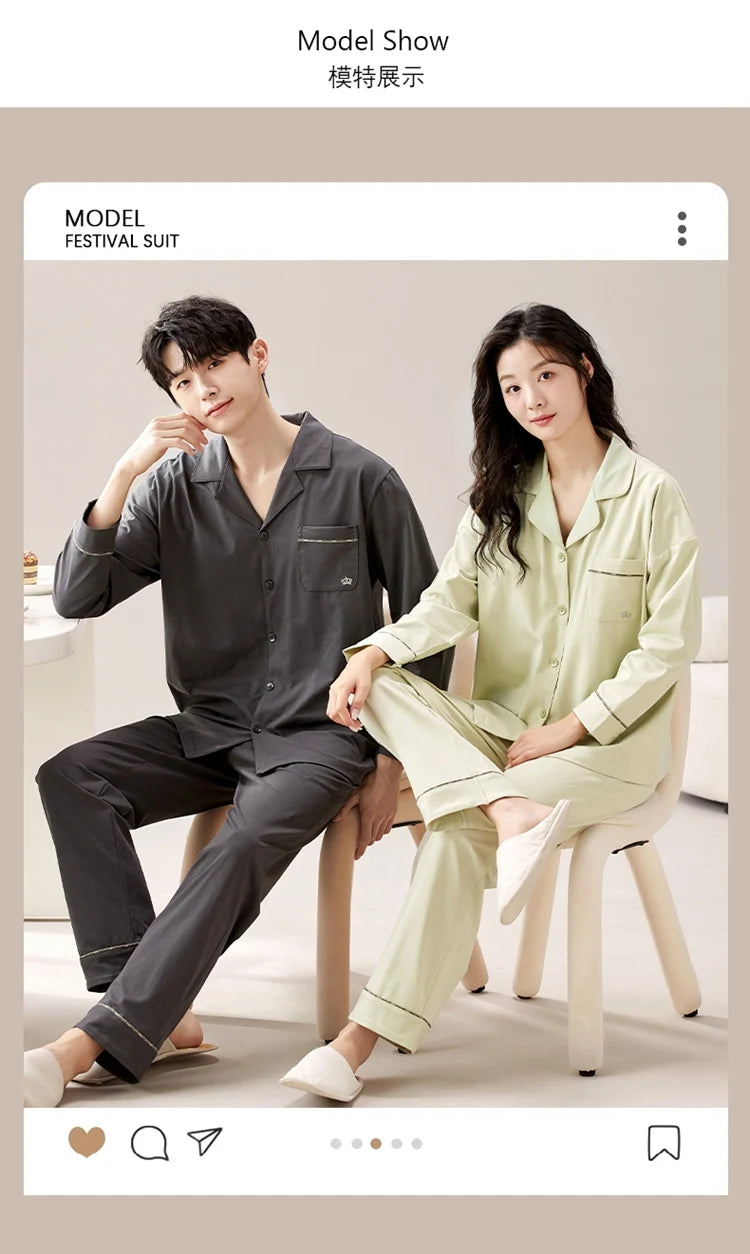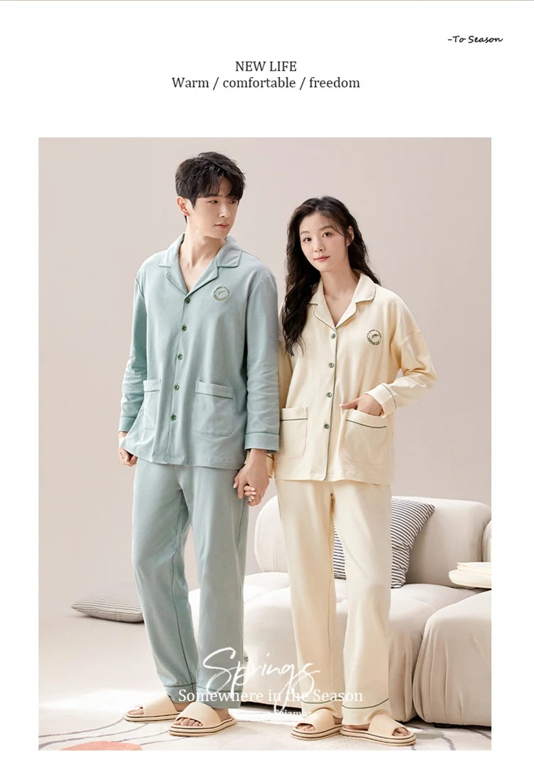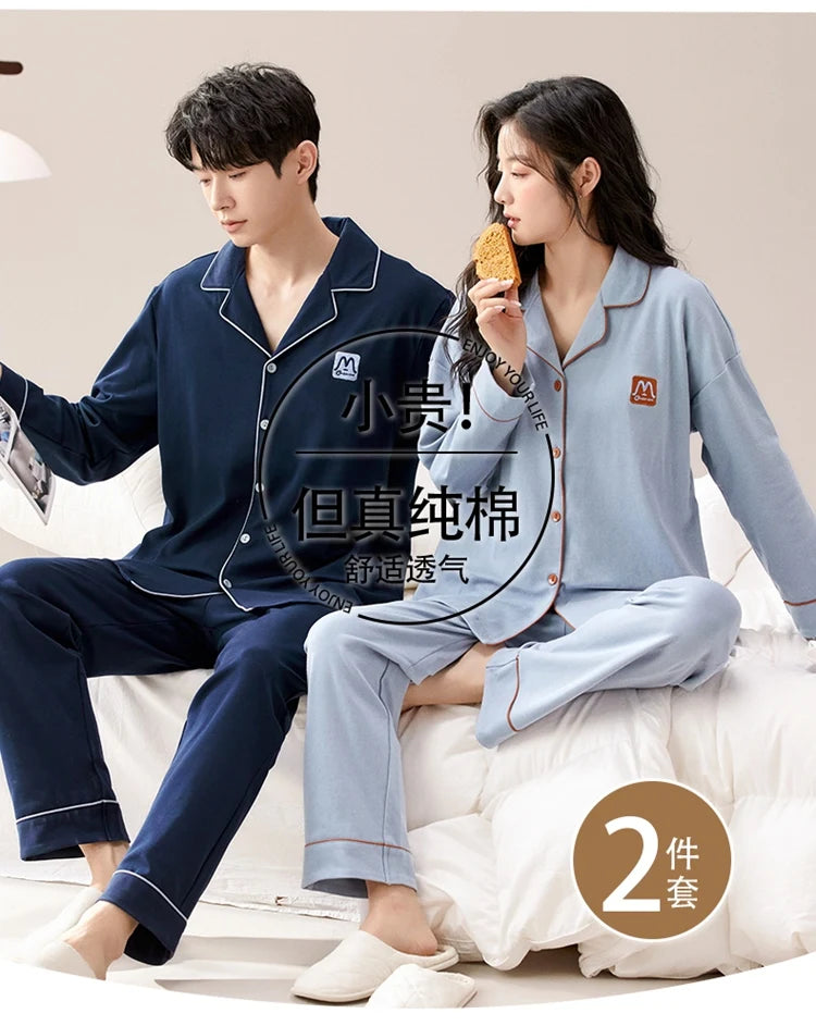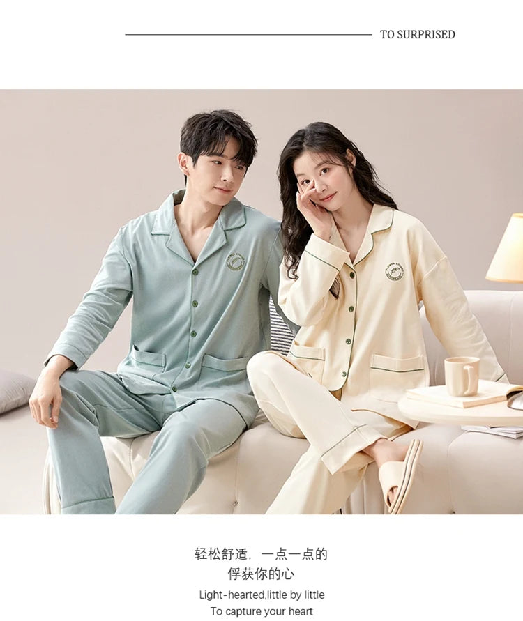 Matchande pyjamas för par med mjuk stickad bomull – perfekt för mysiga kvällar hemma under höst och vinter.