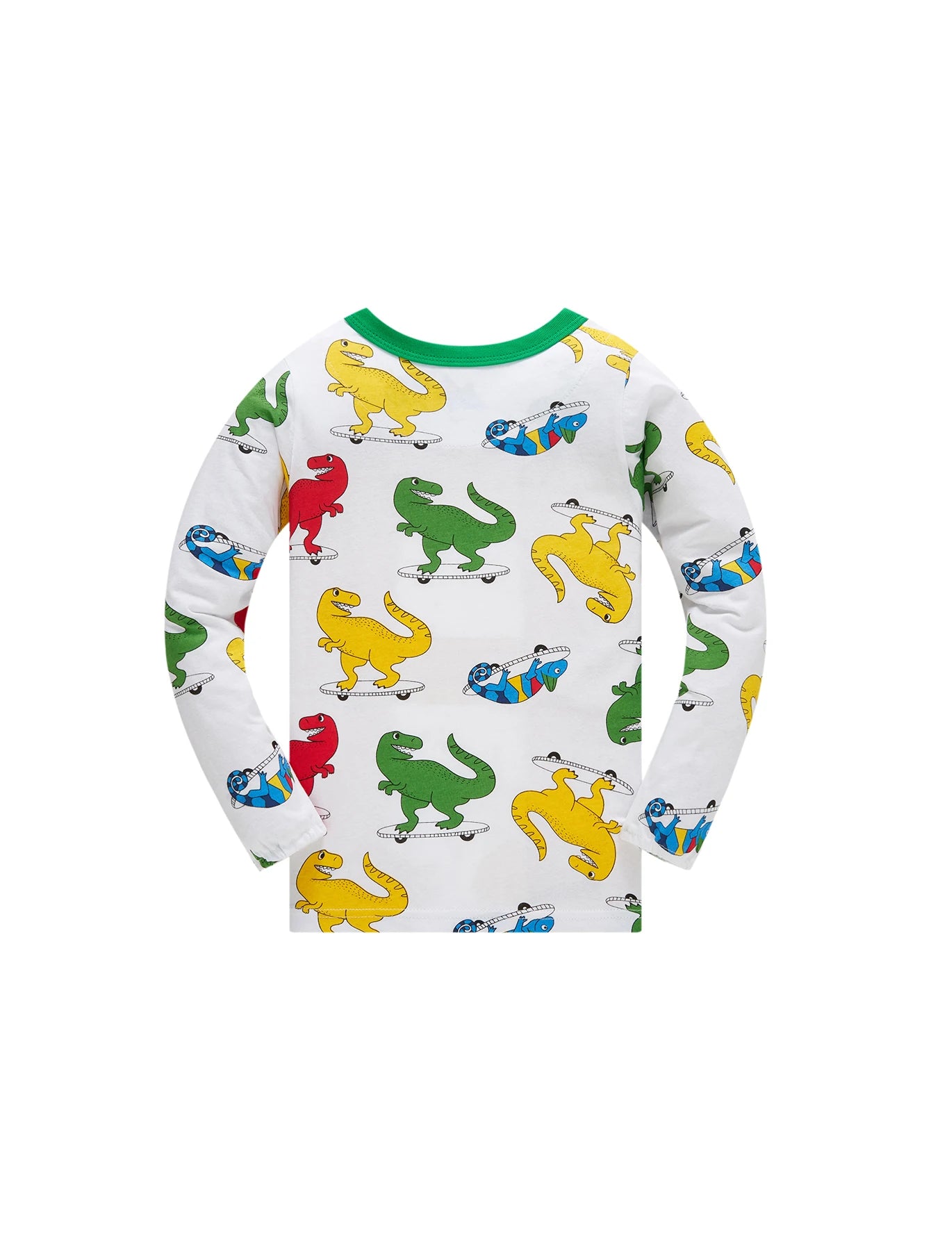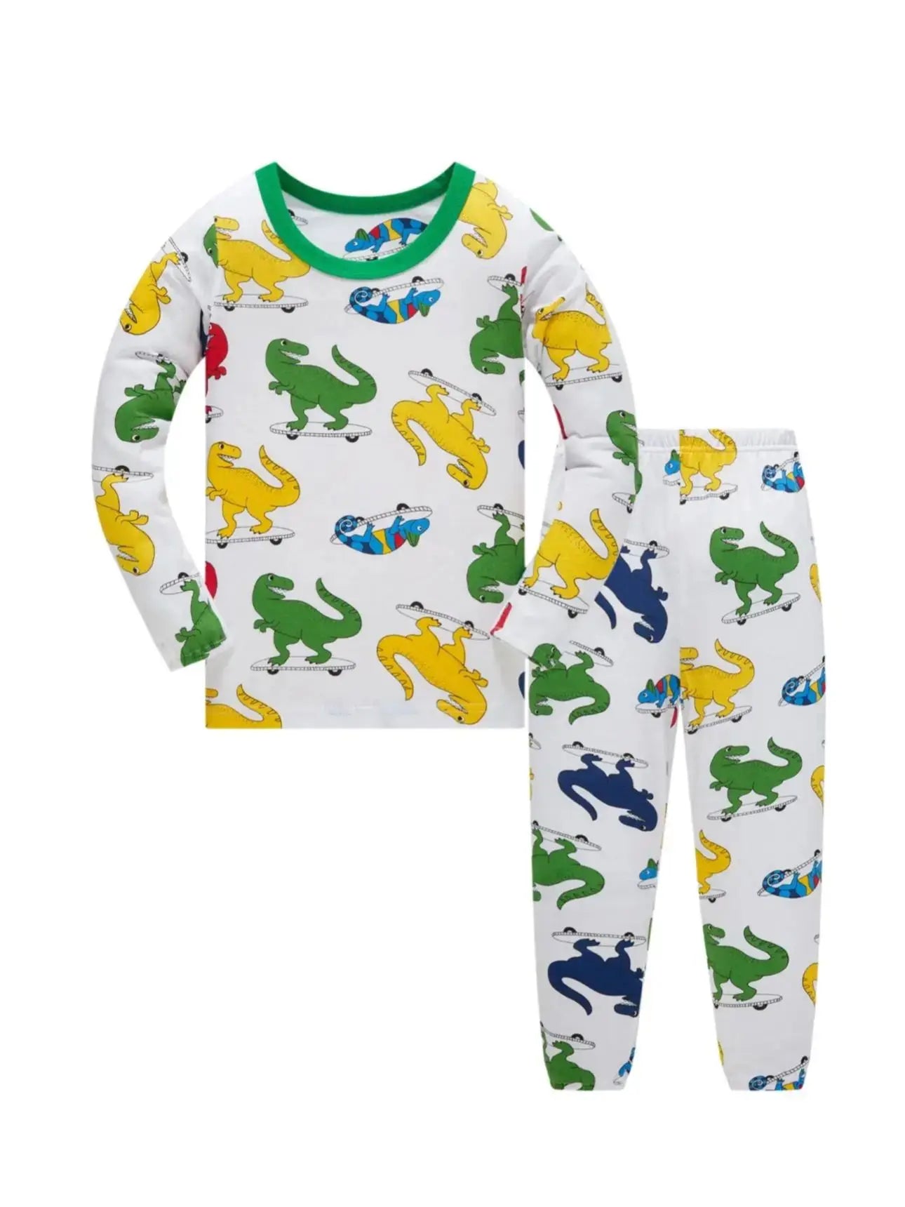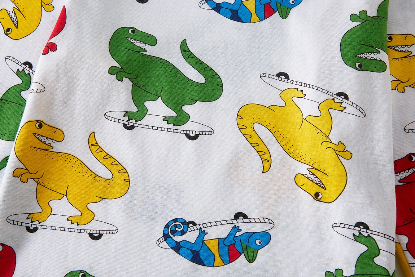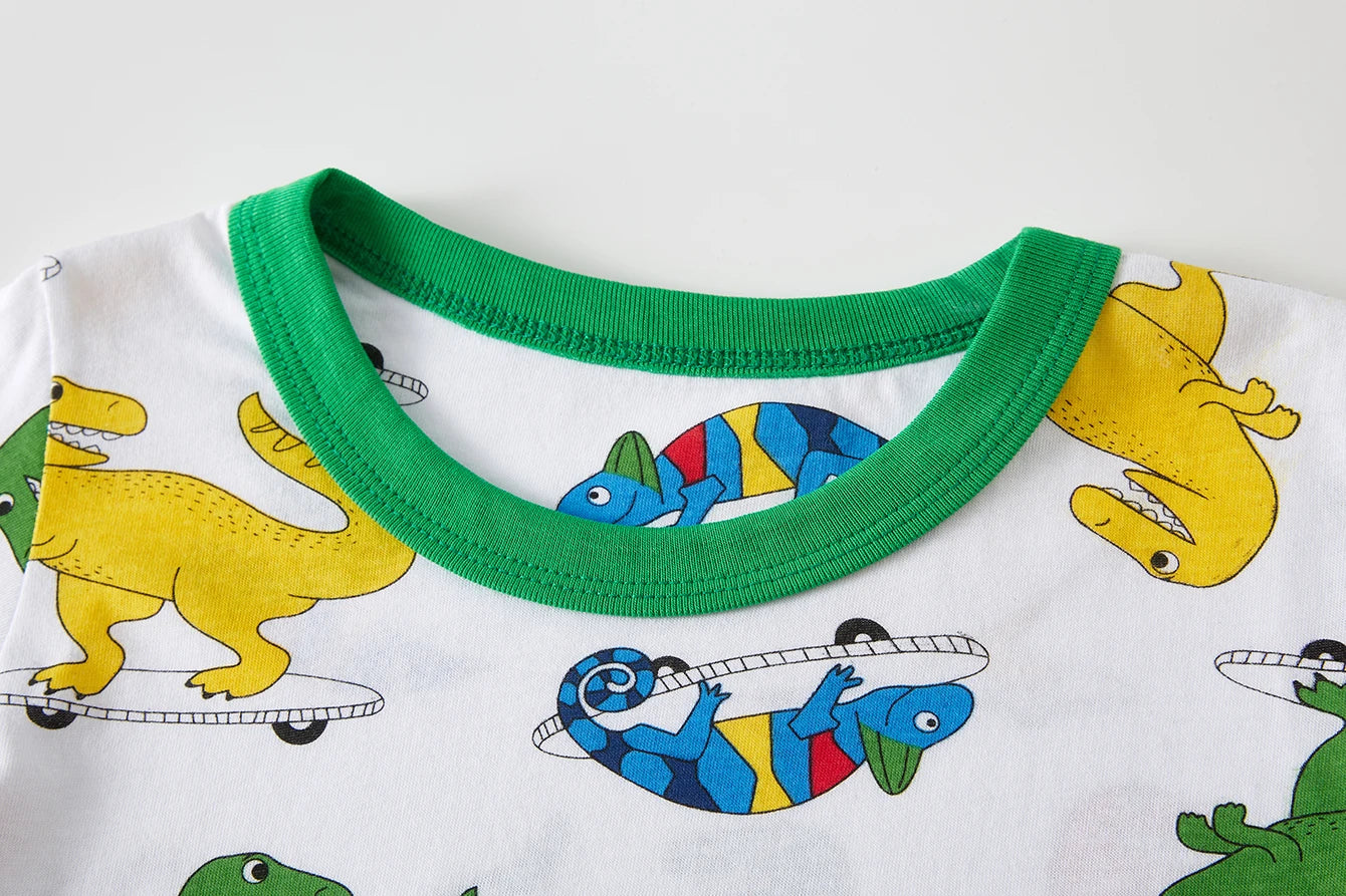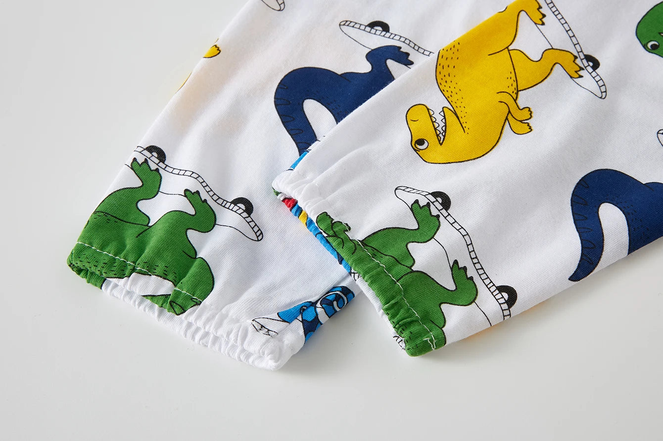 En mjuk och lekfull pyjamas med heltryckt dinosauriemönster – tillverkad i ren jerseybomull. Passar både pojkar och flickor året runt!
