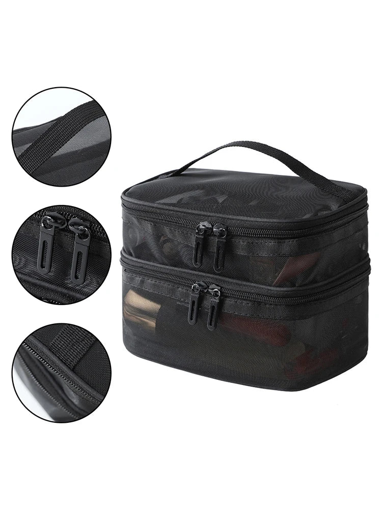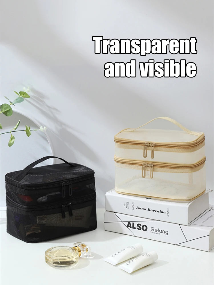 Elegant och praktisk sminkväska med dubbla lager och genomskinligt mesh-utseende – perfekt för kosmetika, toalettartiklar och småsaker.