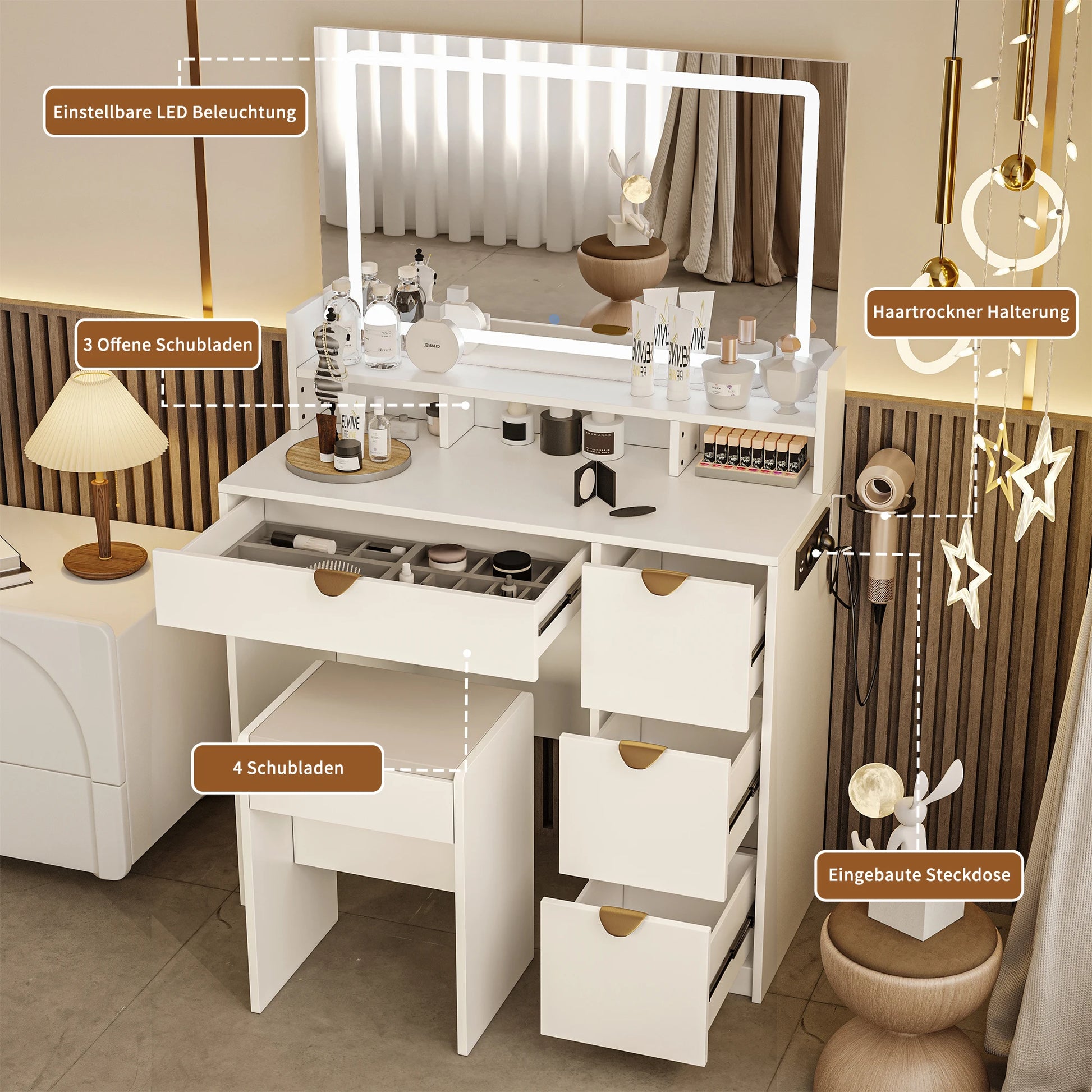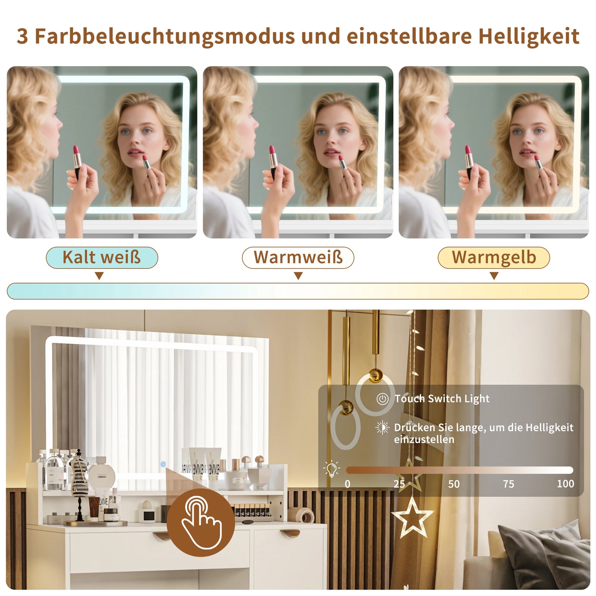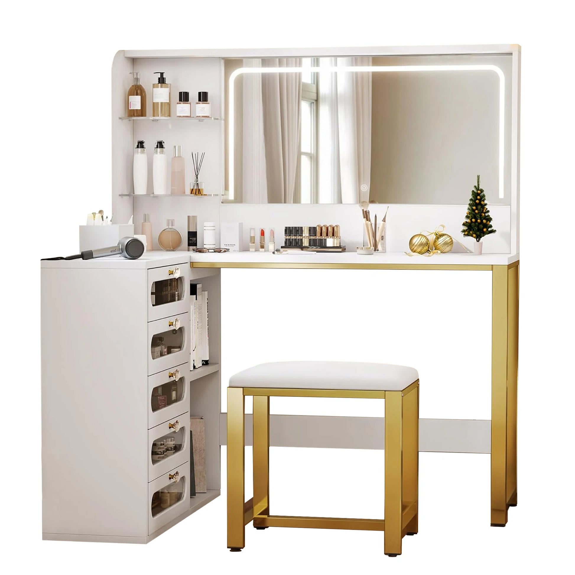 Sminkbord i L‑form med LED-spegel och stoppad pall – Modernt sminkbord med lådor och hyllor
