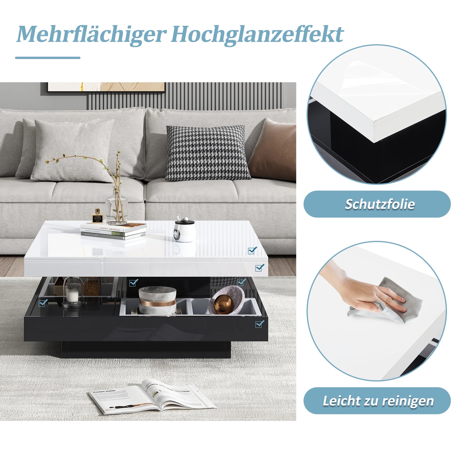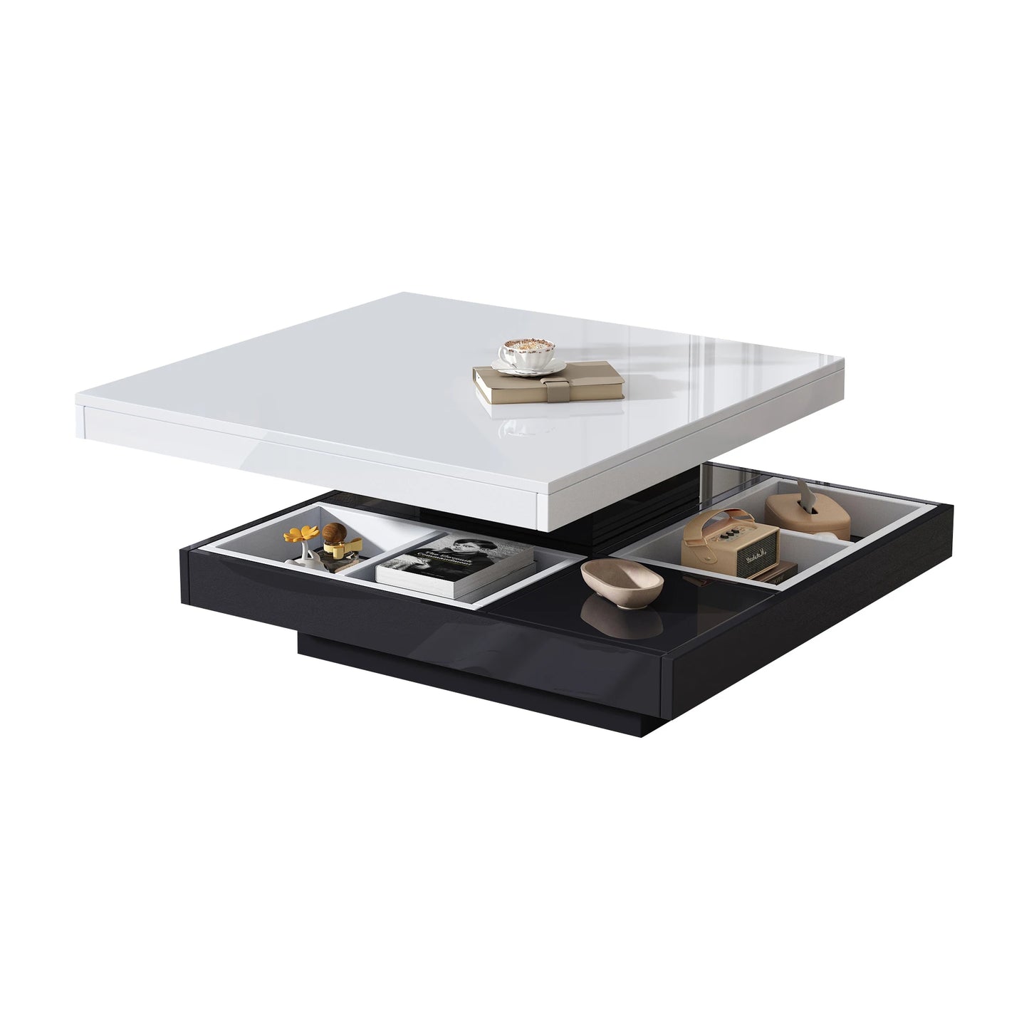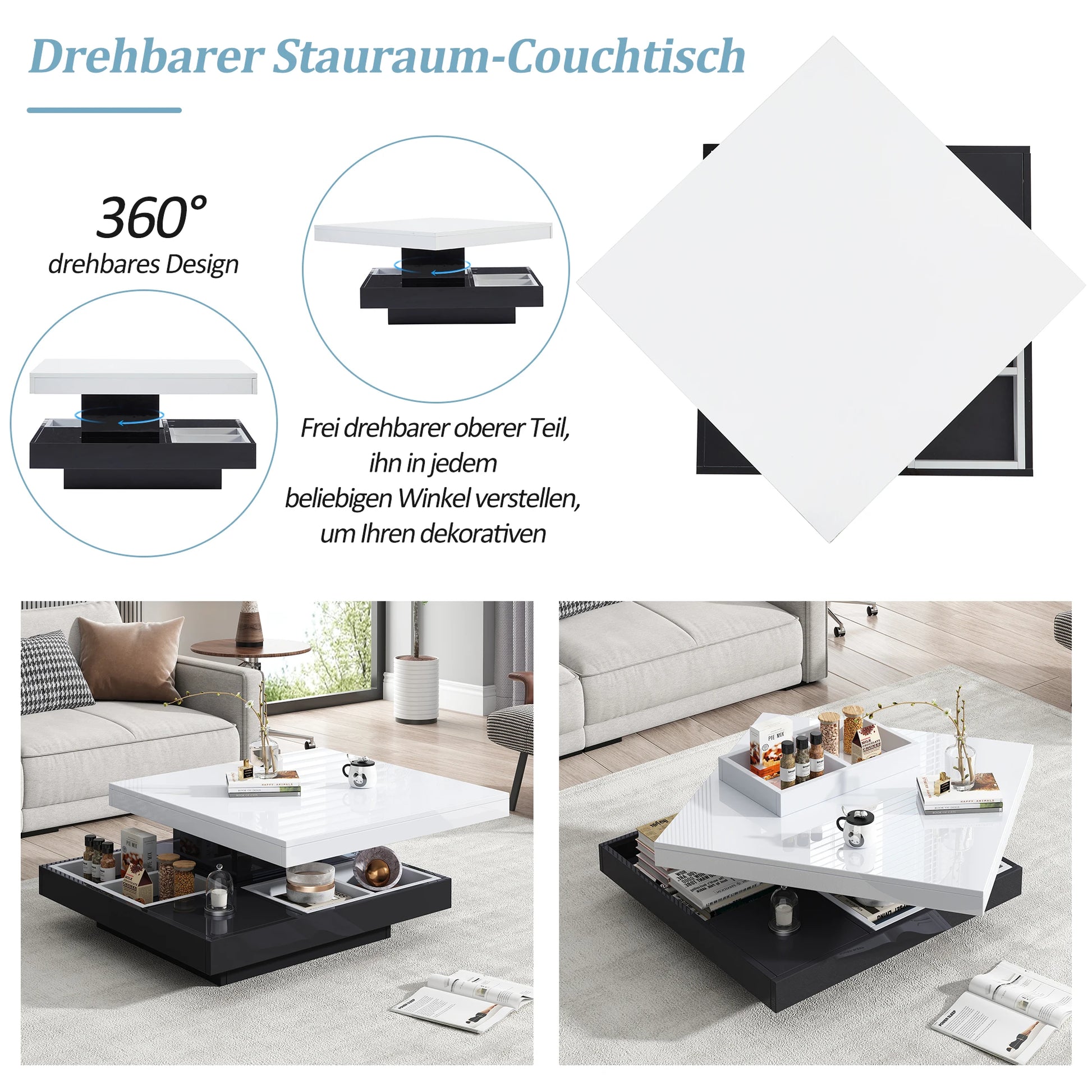 Ett lyxigt soffbord med modern design och smart funktionalitet. Den roterbara toppskivan och den dolda förvaringen gör det till ett perfekt val för stilrena och praktiska vardagsrum.
