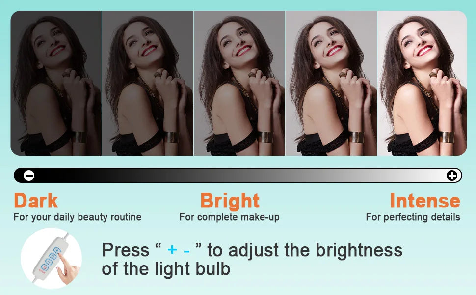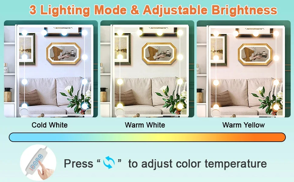 Stor skjutbar spegel med 10 LED-lampor: Ger en klar vy och tre färglägen (varmt, neutralt, kallt) med justerbar ljusstyrka.