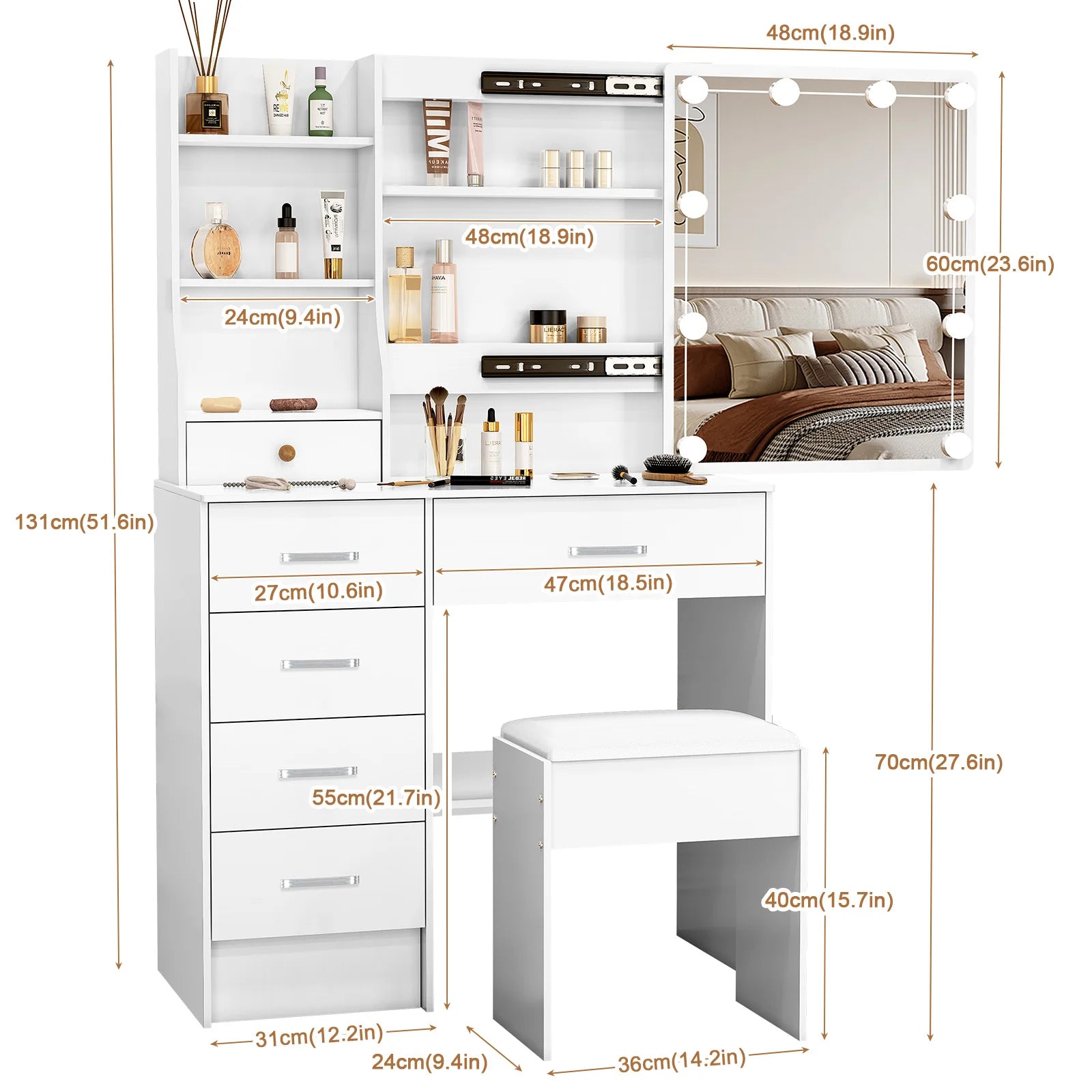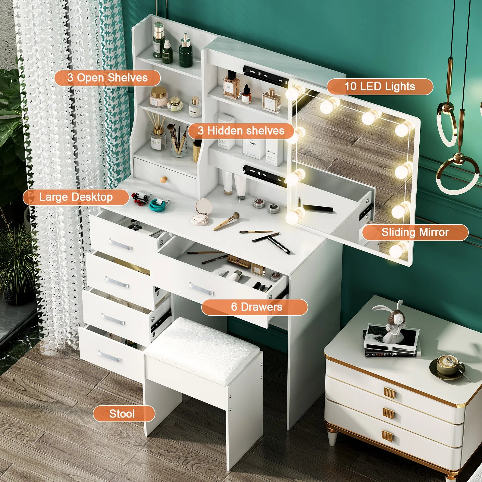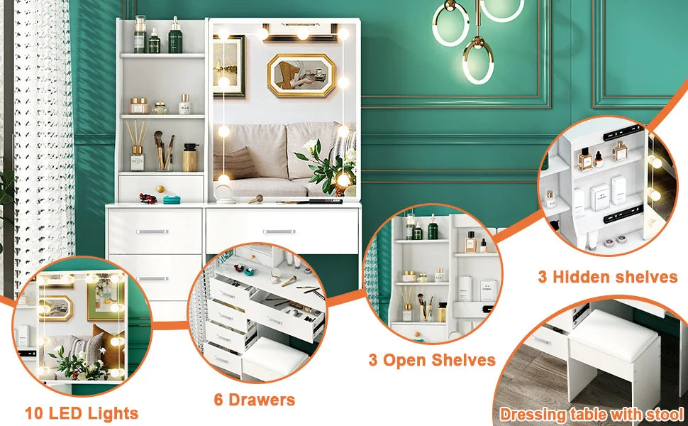 Sminkbord med 10 LED-lampor, skjutbar spegel, 6 lådor och pall – Yamissi/Onesaimei