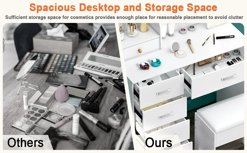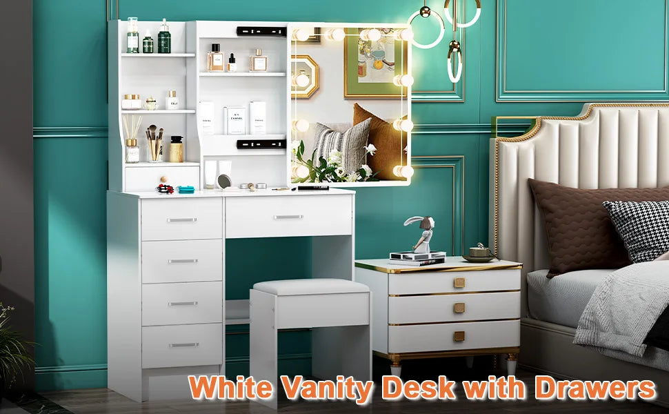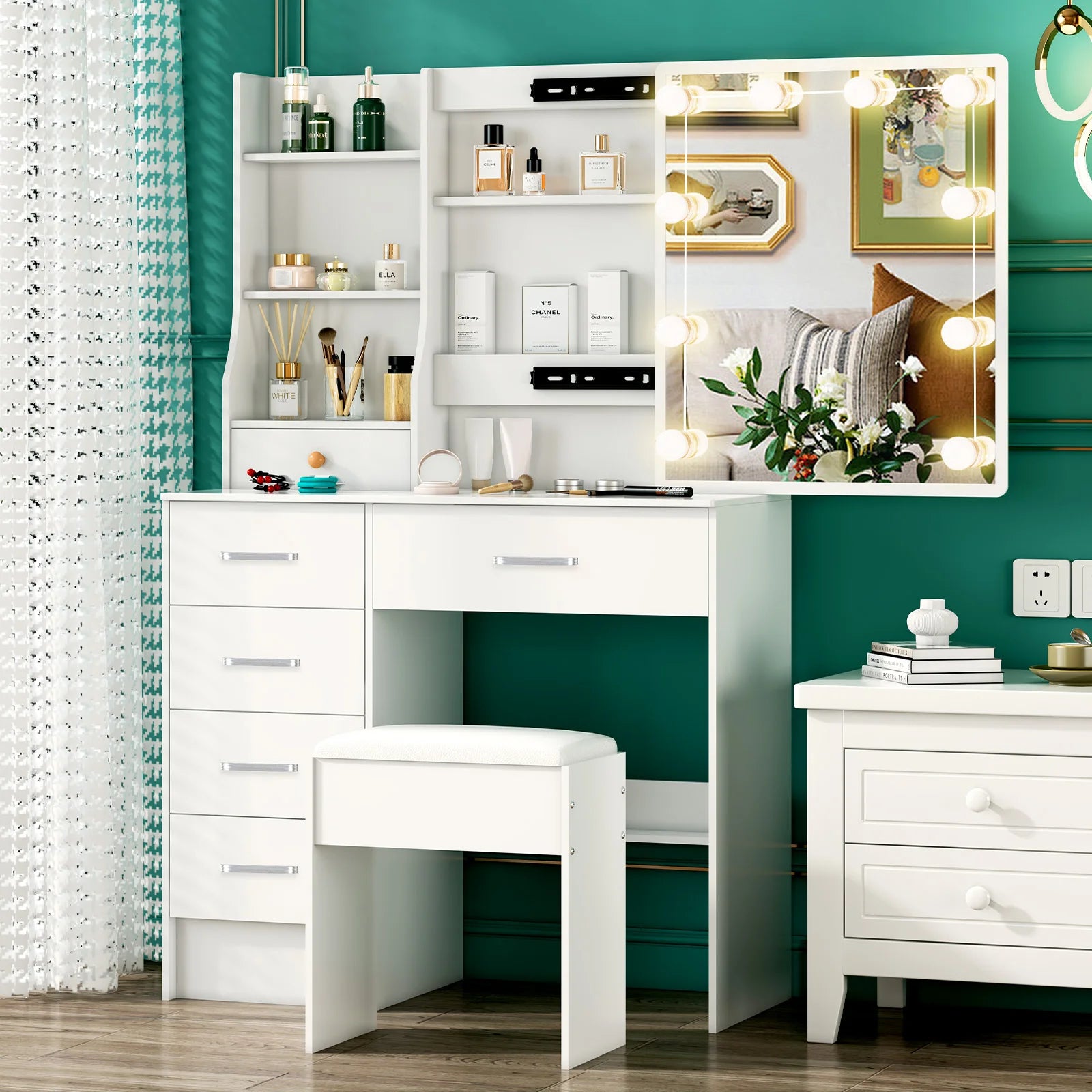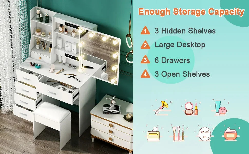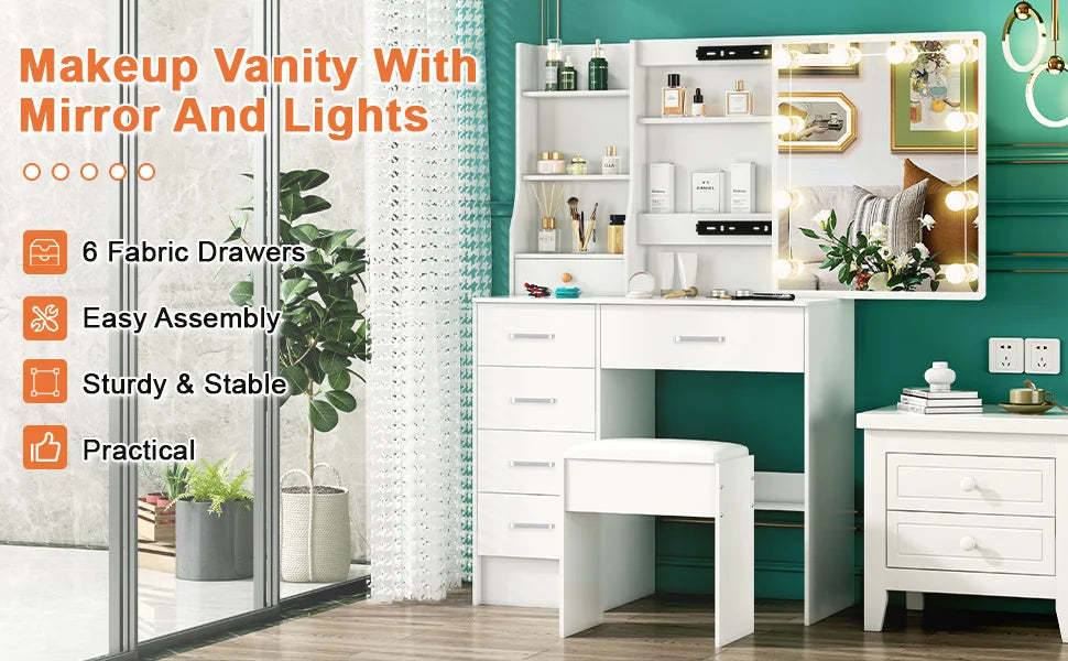 Sminkbord med 10 LED-lampor, skjutbar spegel, 6 lådor och pall – Yamissi/Onesaimei