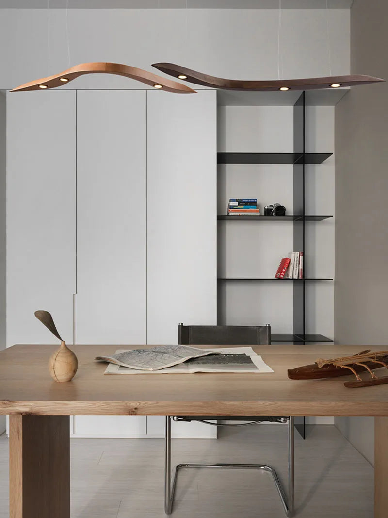 En stilren och funktionell taklampa i trä med varmvit LED-belysning. Perfekt för vardagsrum, matsal, köksö eller utställningshall – där design möter komfort.