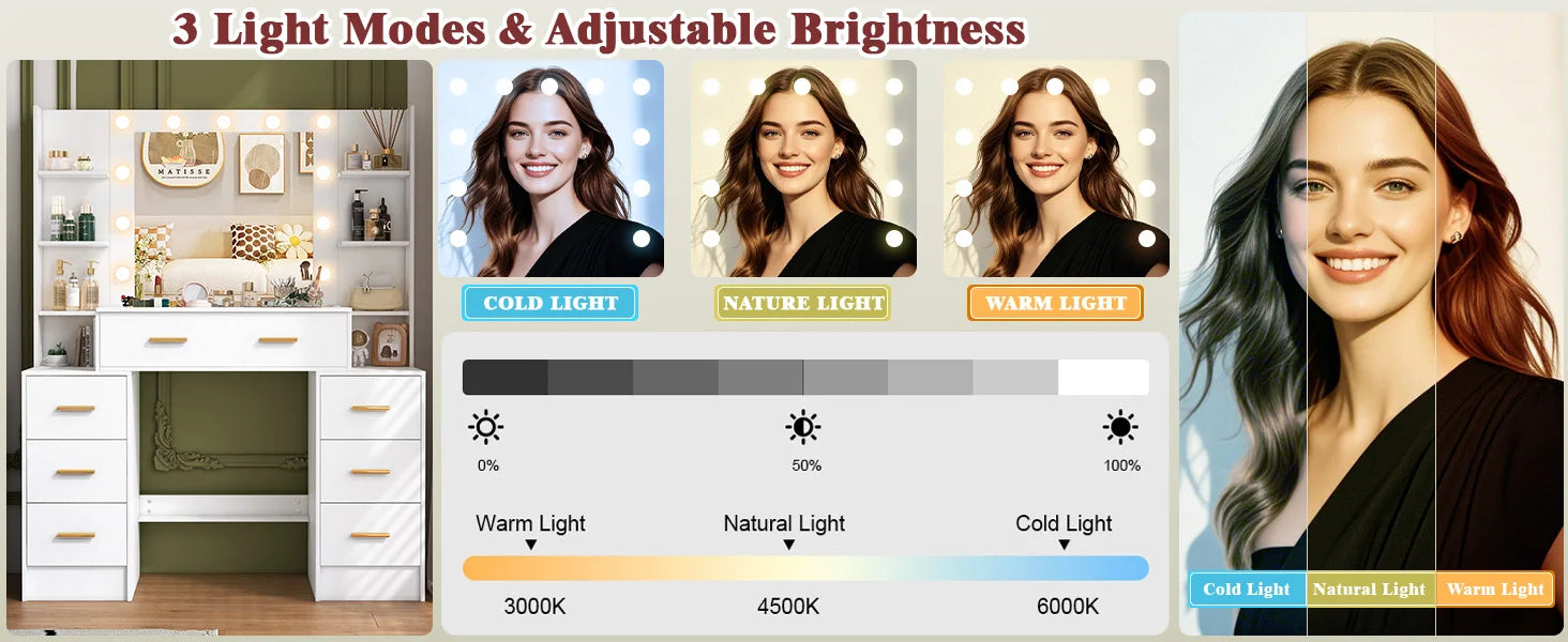 Justerbara LED-lampor: 11 lampor med tre ljuslägen (varmt, naturligt, kallt) och justerbar ljusstyrka. Perfekt för både makeup och som stämningsbelysning.