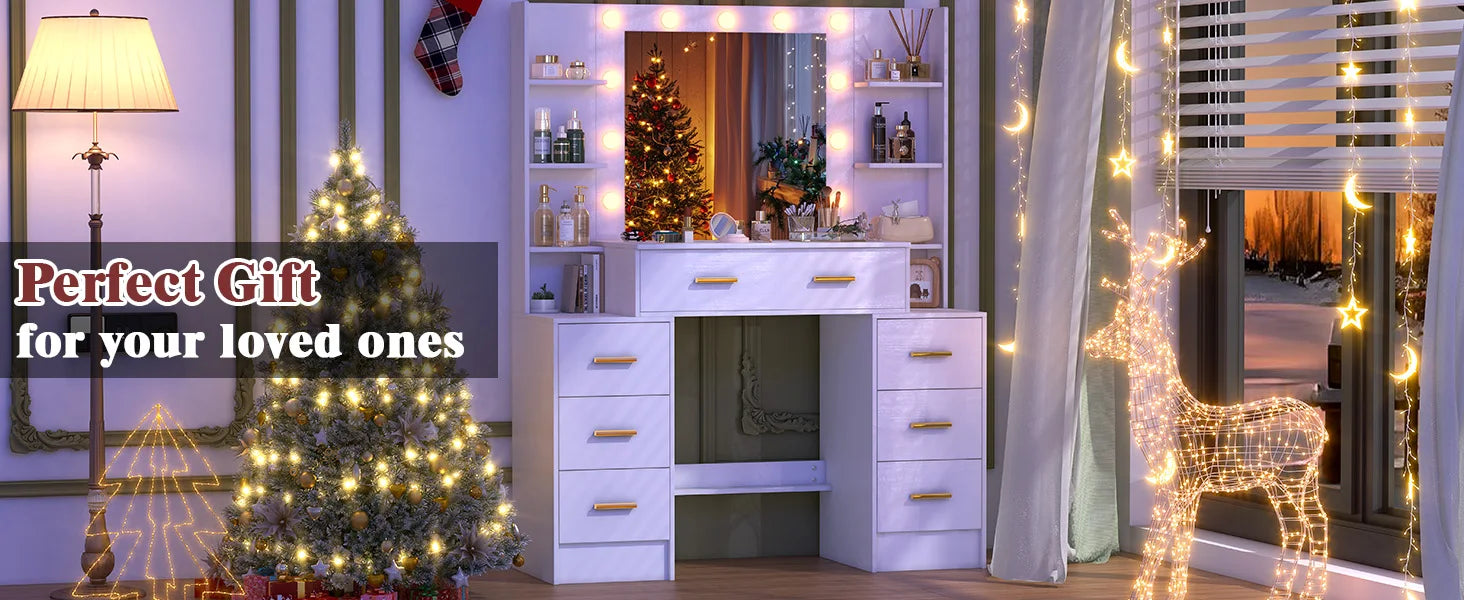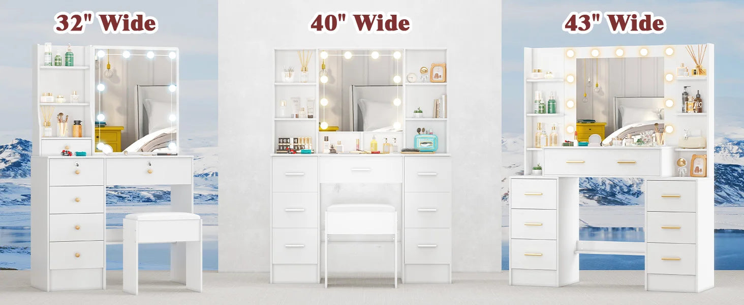 Generöst förvaringsutrymme: 7 lådor och 8 öppna hyllor ger gott om plats för smink, hudvård och accessoarer.