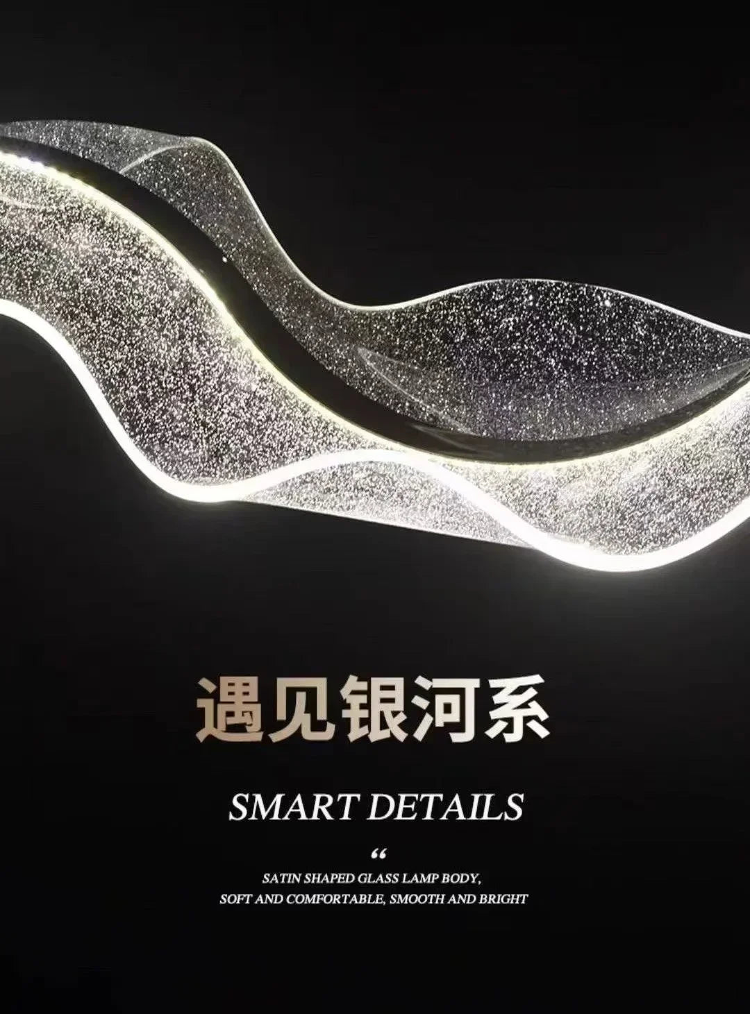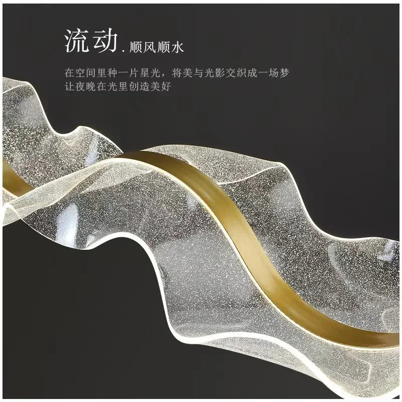 En modern och konstnärlig vågformad taklampa med gyllene finish – perfekt för att skapa stilren atmosfär i hemmet eller på café.