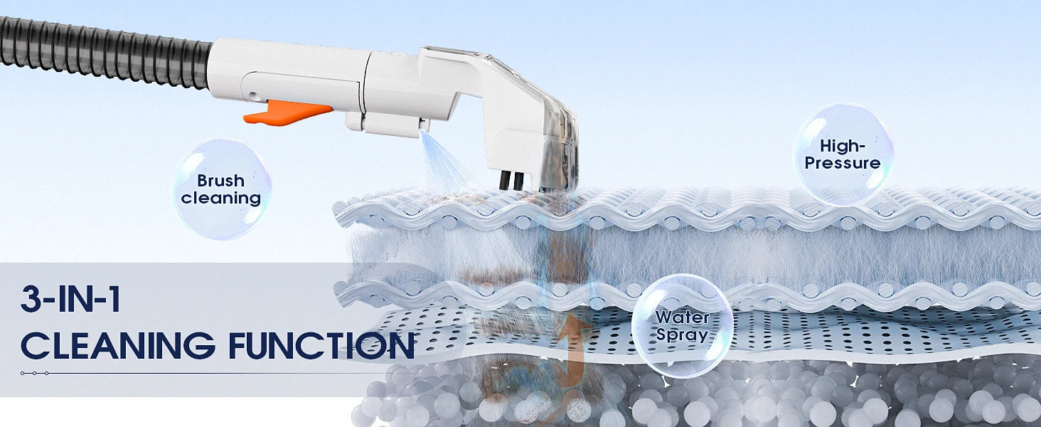 3-i-1 system: Spraya, borsta och sug – för snabbare torkning och professionell rengöring