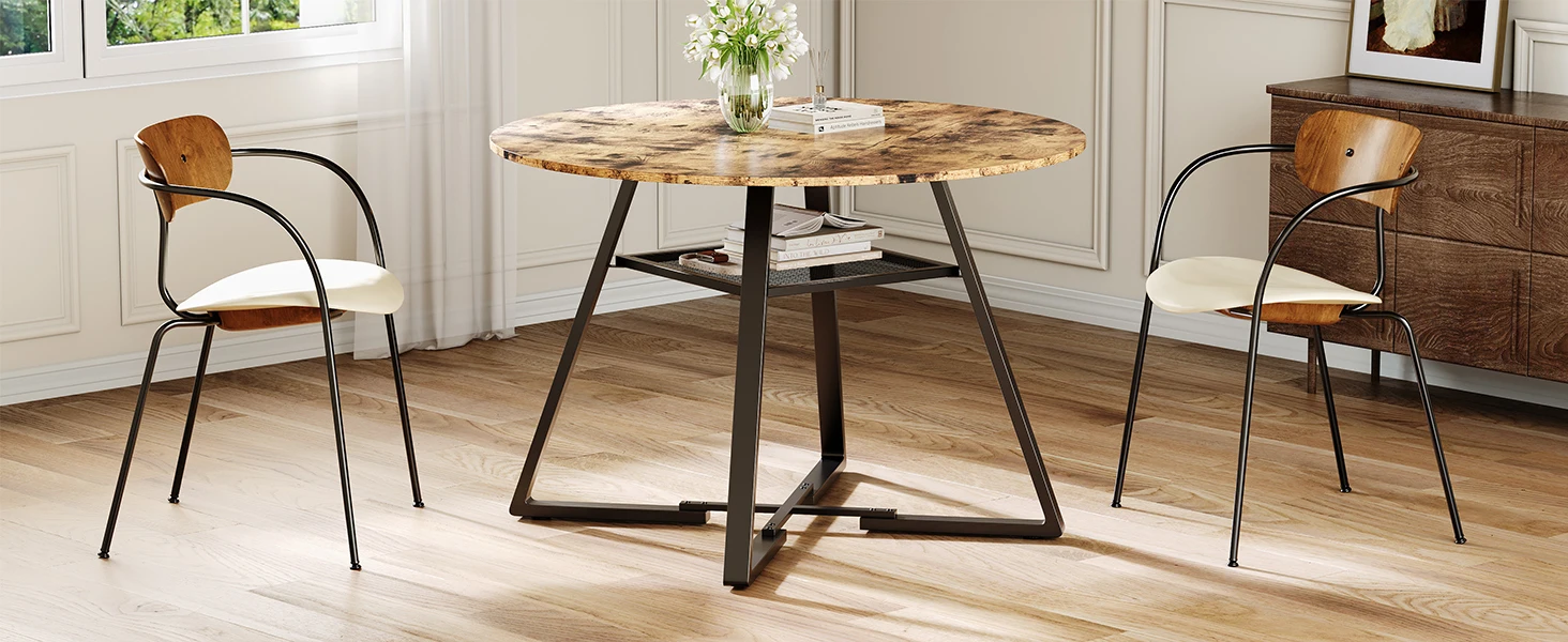 Detta moderna matbord från Rosahqnda kombinerar industriell stil med praktisk förvaring. Den runda bordsskivan i trälook och den svarta metallramen ger ett stilrent uttryck som passar perfekt i kök, vardagsrum eller matsal. Den inbyggda hyllan under bordet är idealisk för mindre utrymmen och ger extra plats för förvaring av vardagsföremål.