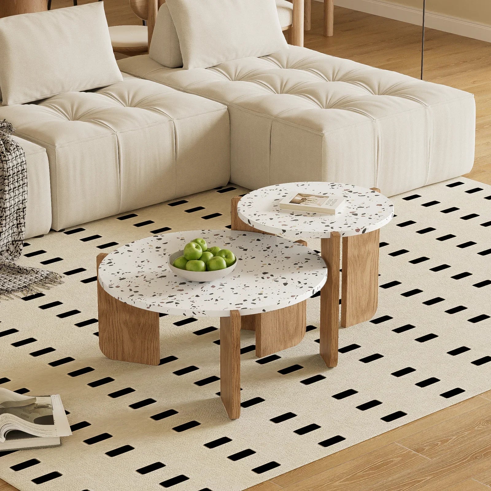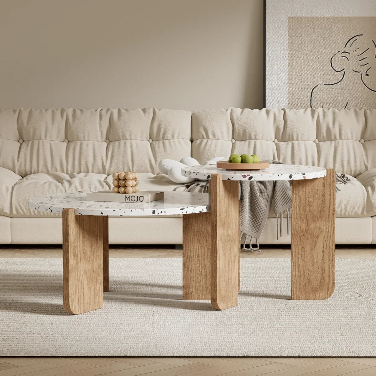 Rosahqnda 2-delat Runt Soffbord – Vit & Trä – Stapelbar Design – 70 & 50 cm