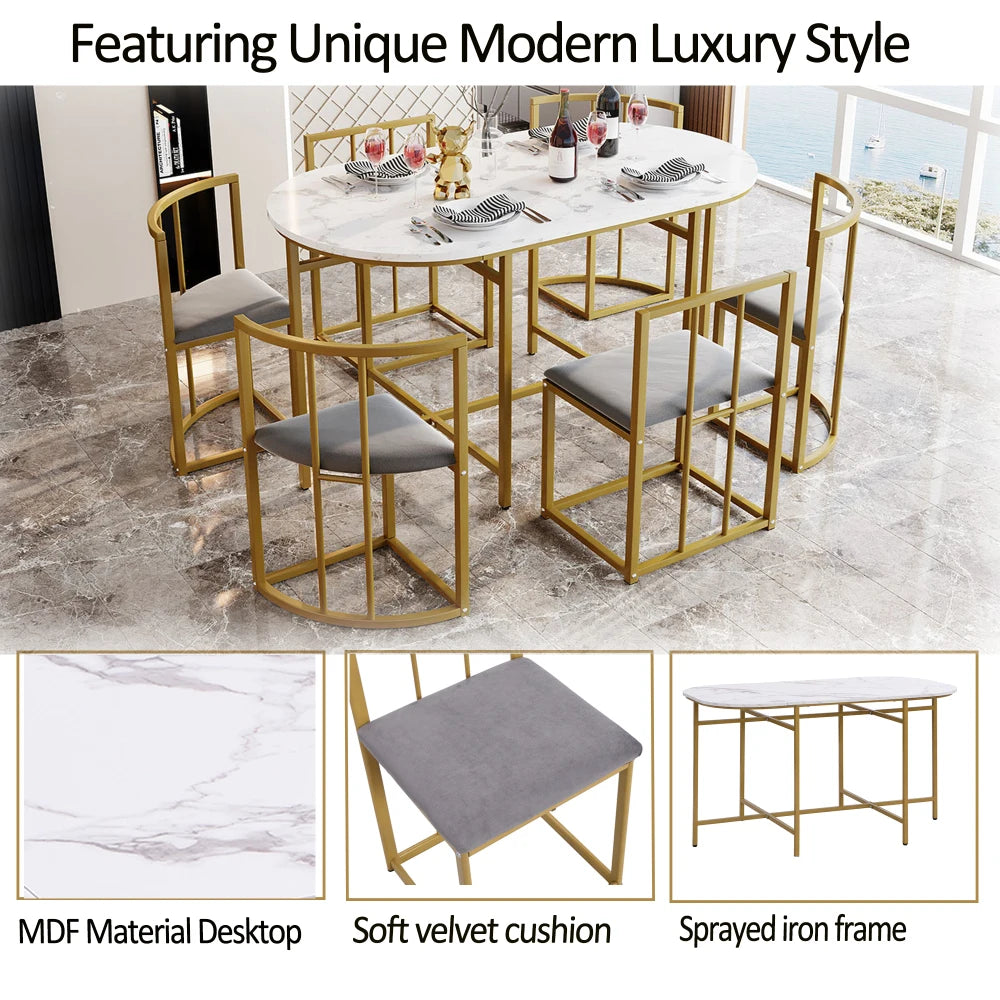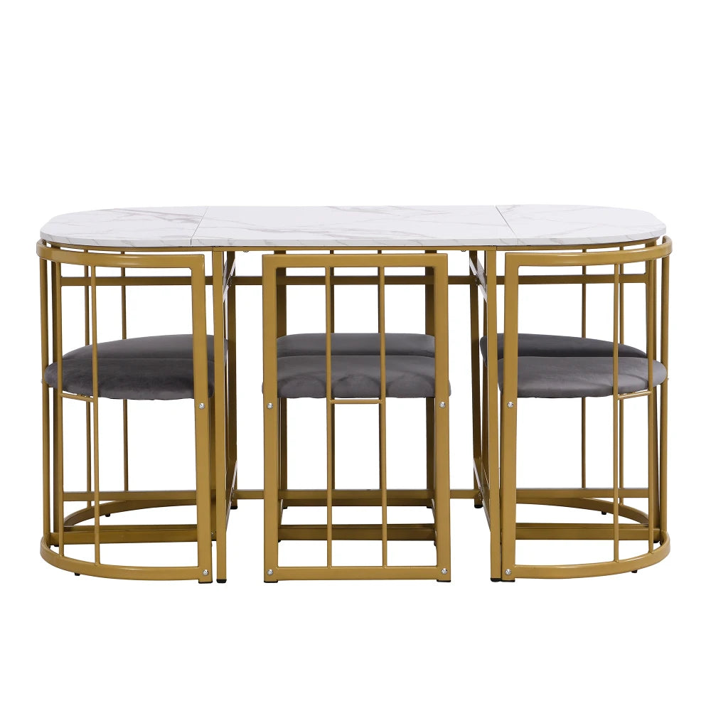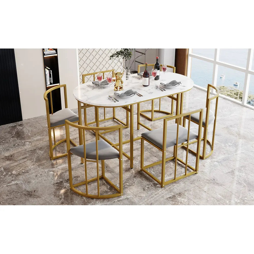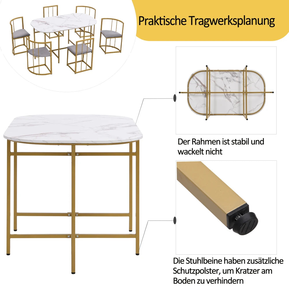 Lyxig Matgrupp med 6 Stolar – Vit Bordsskiva & Guldfärgad Ram