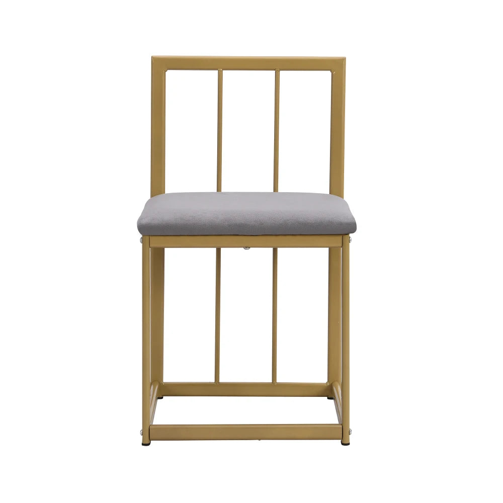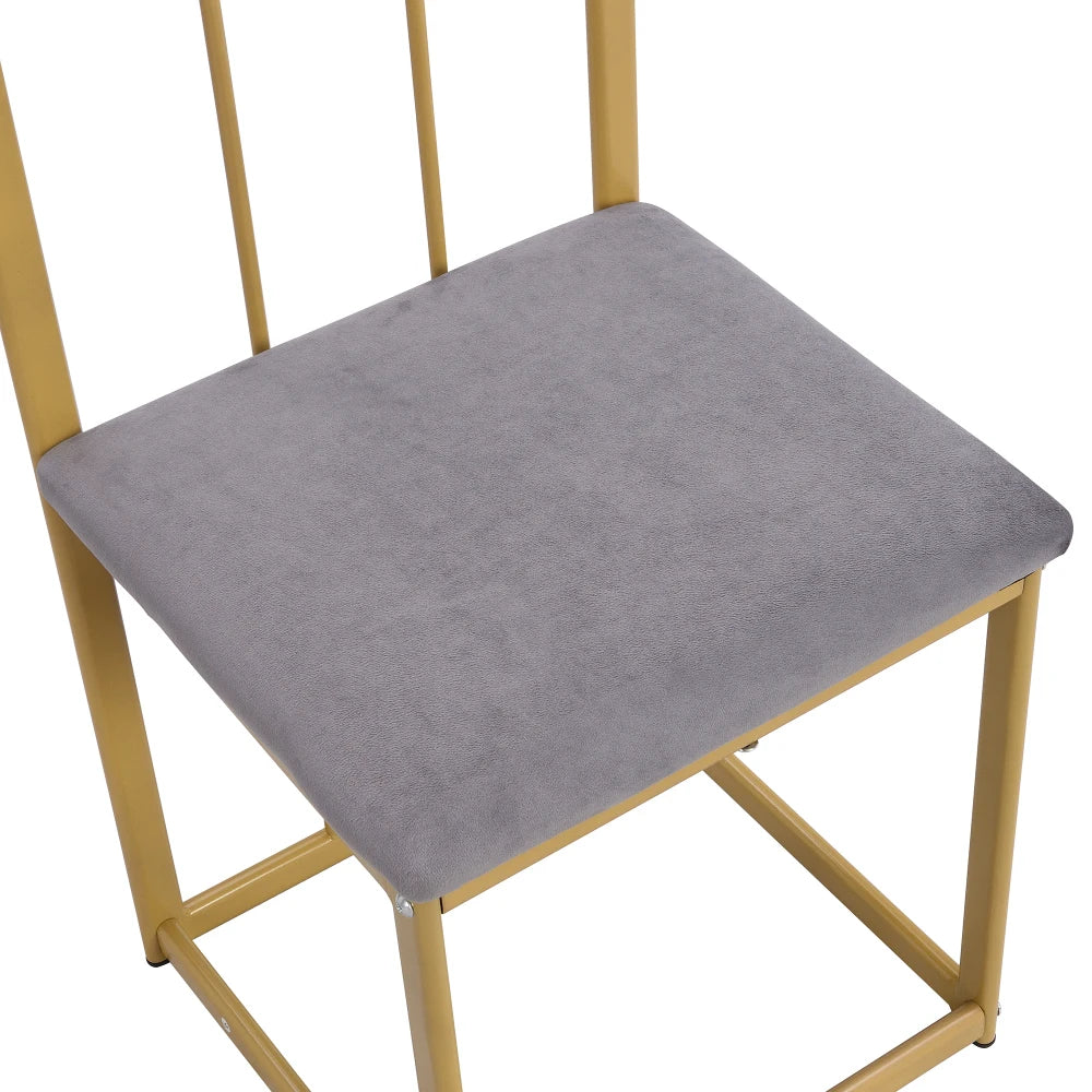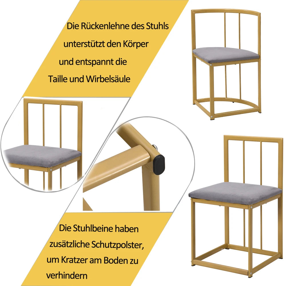 Skapa en elegant och inbjudande matplats med denna moderna matgrupp. Med vit bordsskiva, grå sammetsklädda stolar och guldfärgade metallben kombinerar den stil, komfort och funktion – perfekt för både vardagsmiddagar och festliga tillfällen.