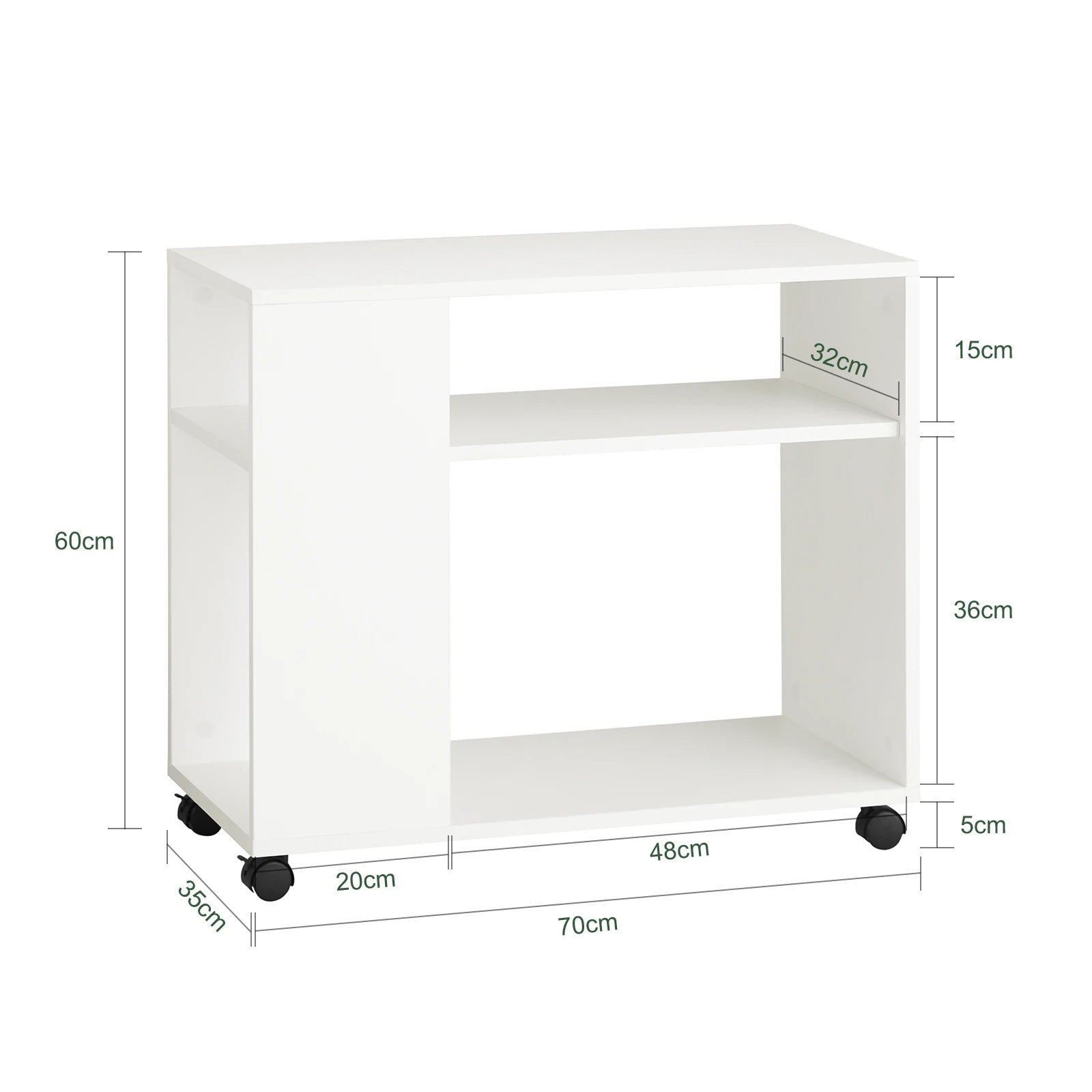 Ett modernt och mångsidigt sidobord som kombinerar smart förvaring med stilren design. Perfekt som soffbord, nattduksbord eller tidningsställ – och tack vare de praktiska hjulen är det enkelt att flytta runt i hemmet.