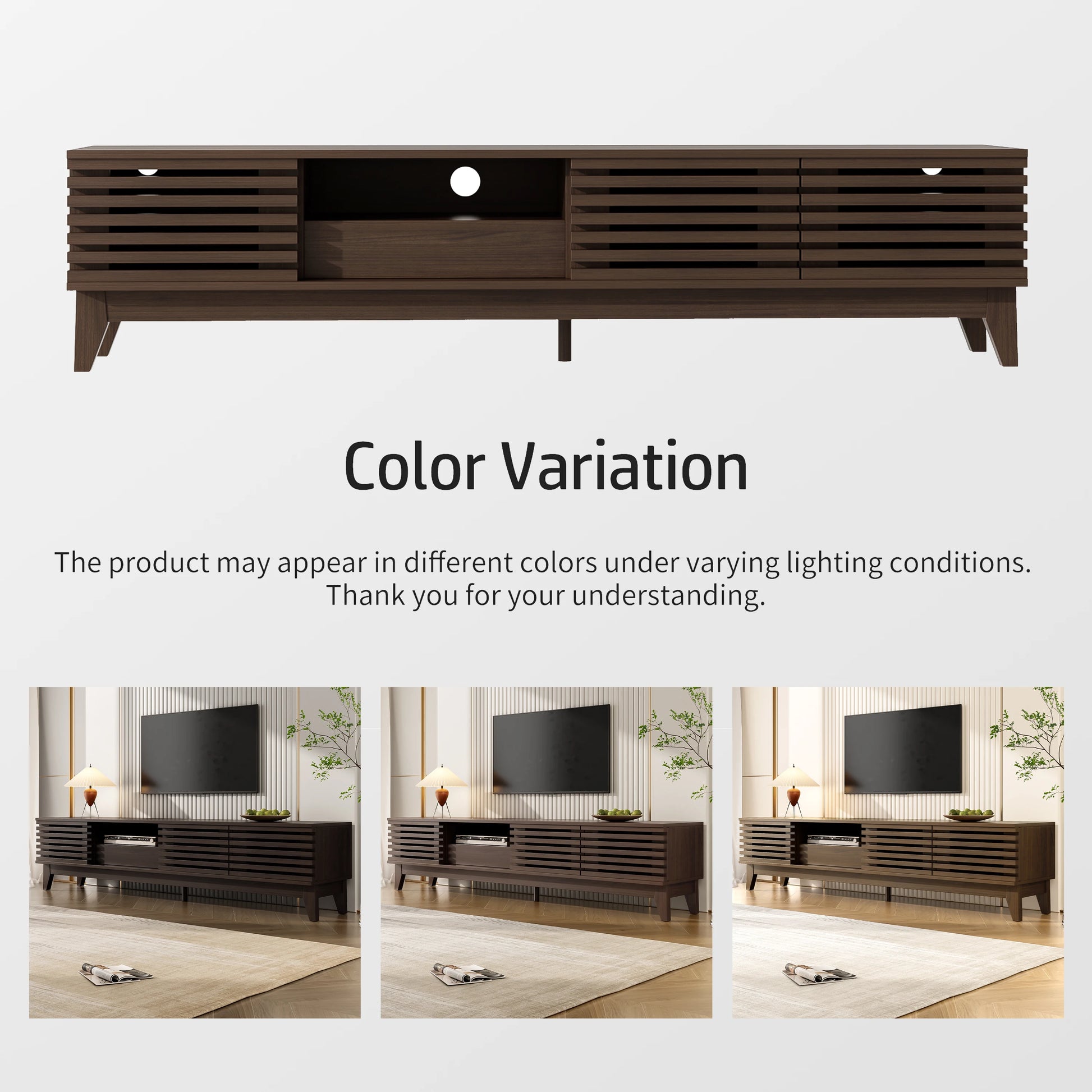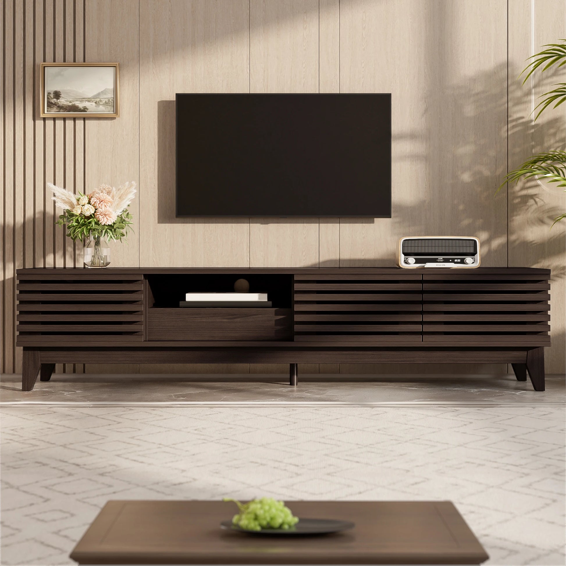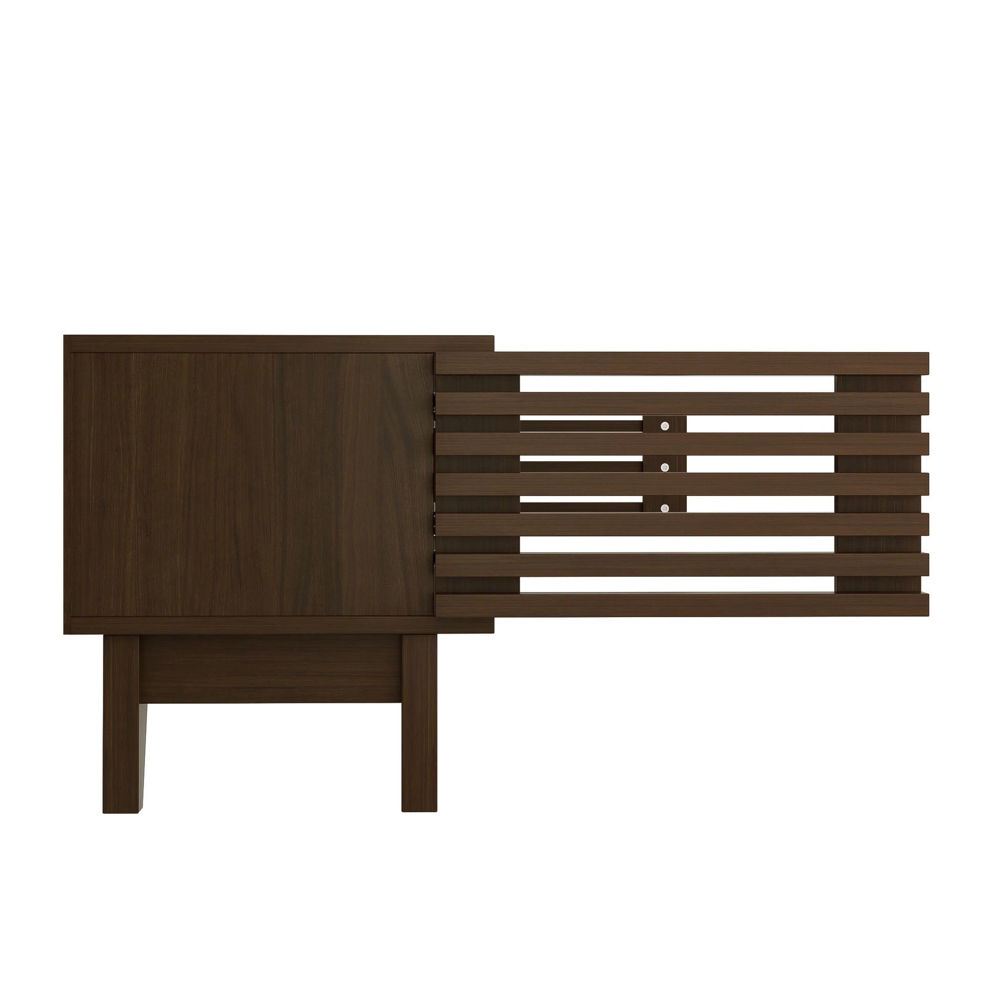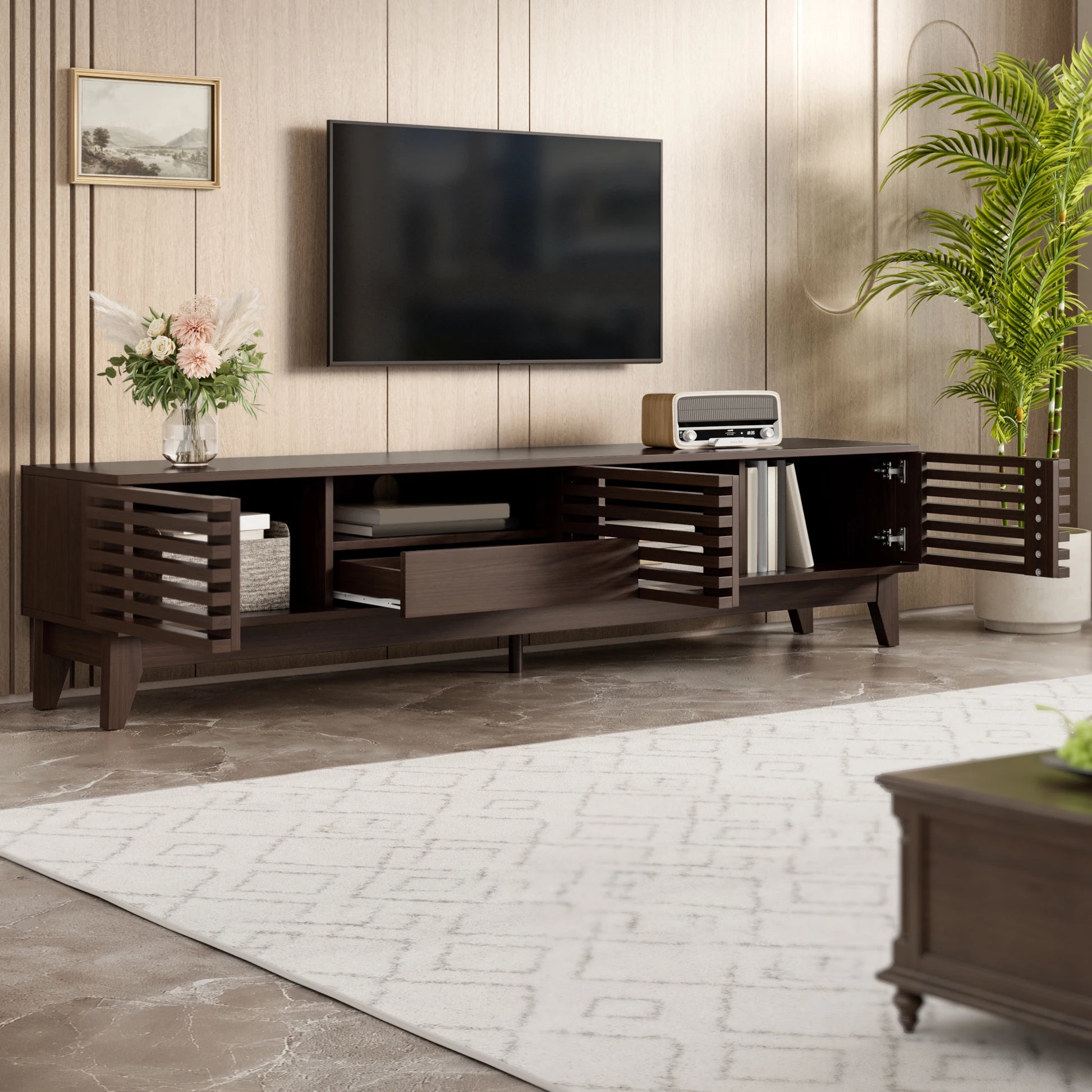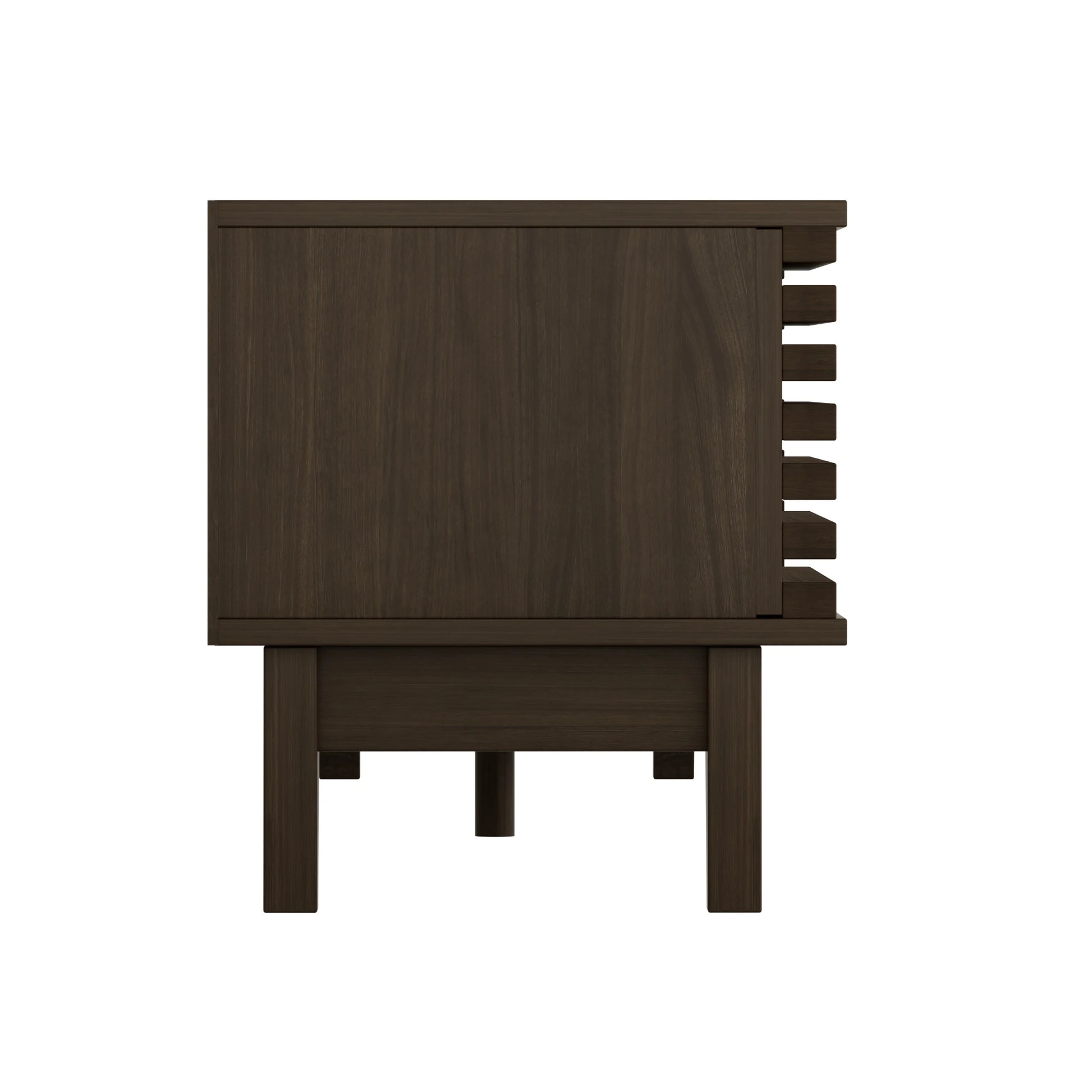 En särskild höjdpunkt är dörrarnas design – med trälameller i vintage-stil som ger möbeln ett unikt och stilrent uttryck. Denna detalj kombinerar modern funktion med retroestetik och skapar en mysig atmosfär i vardagsrummet.