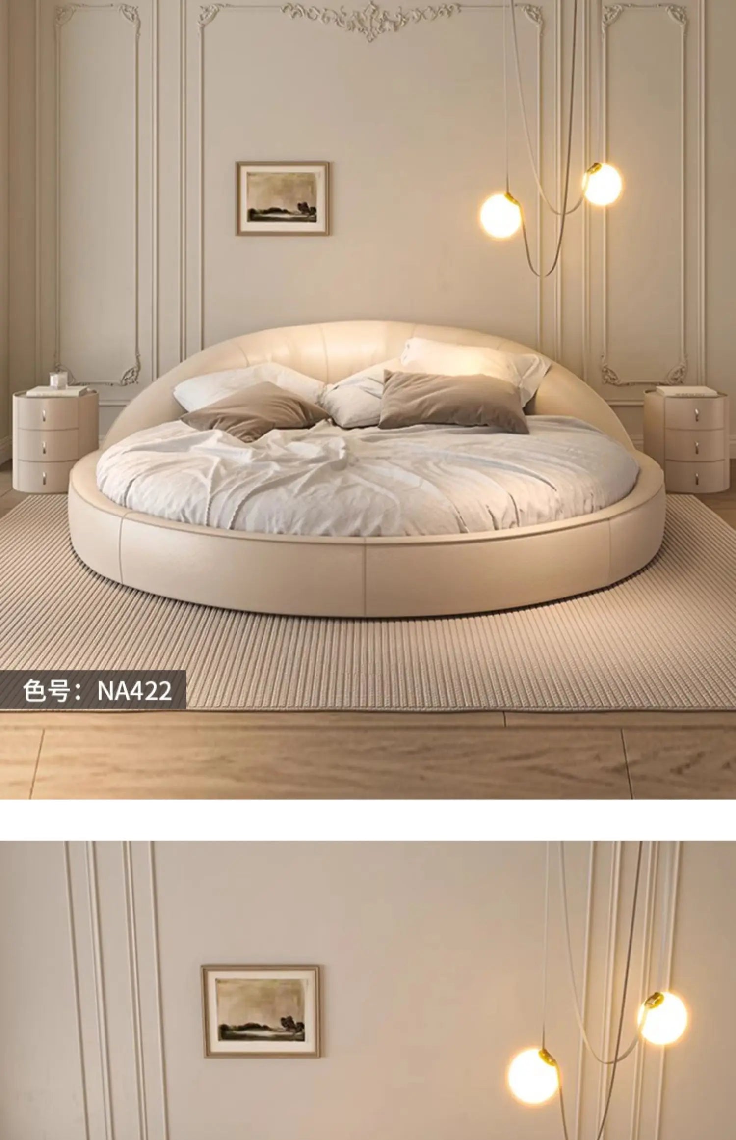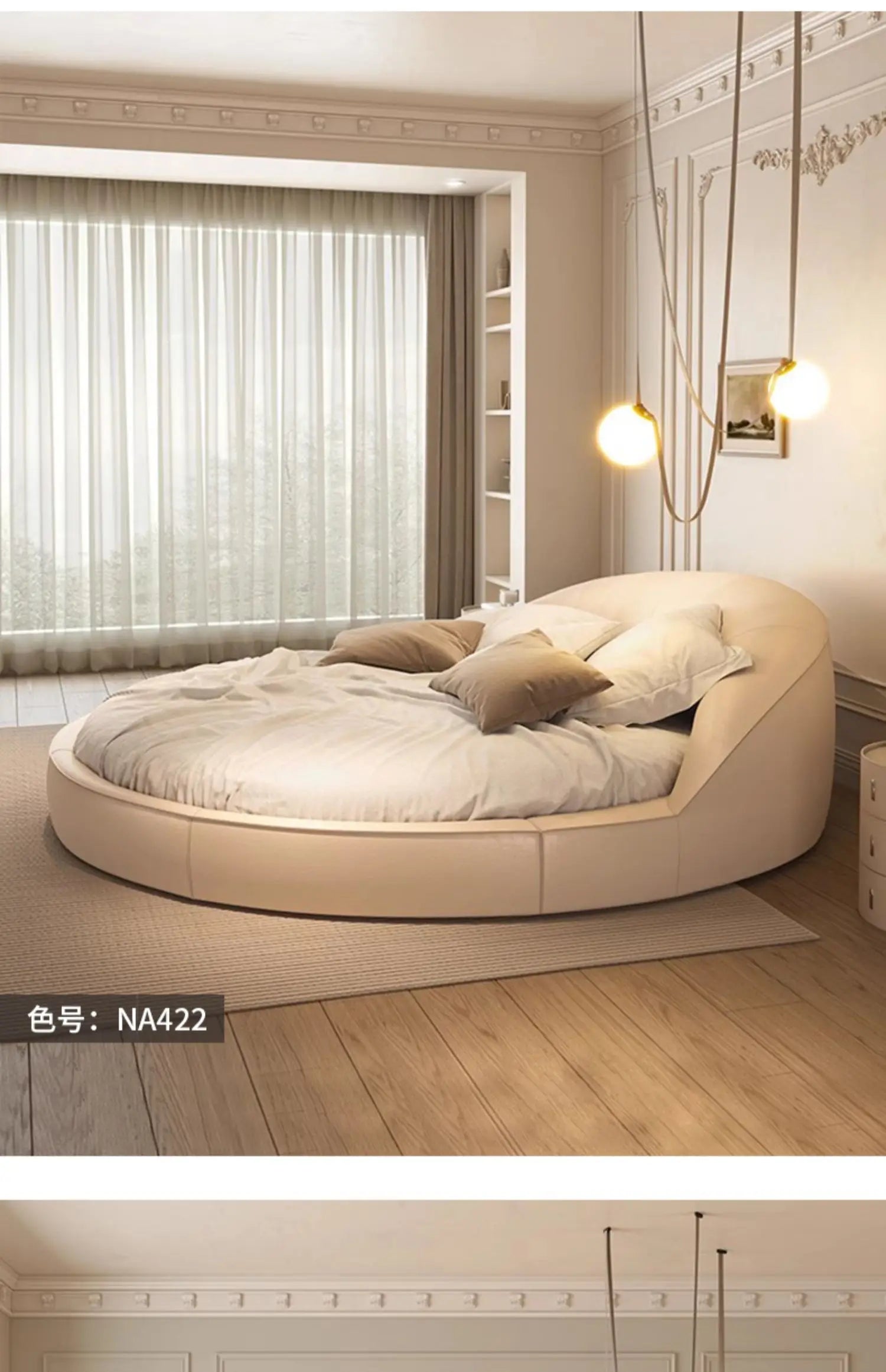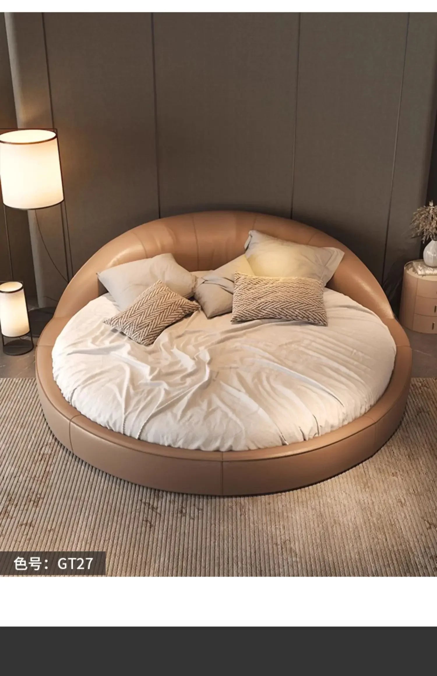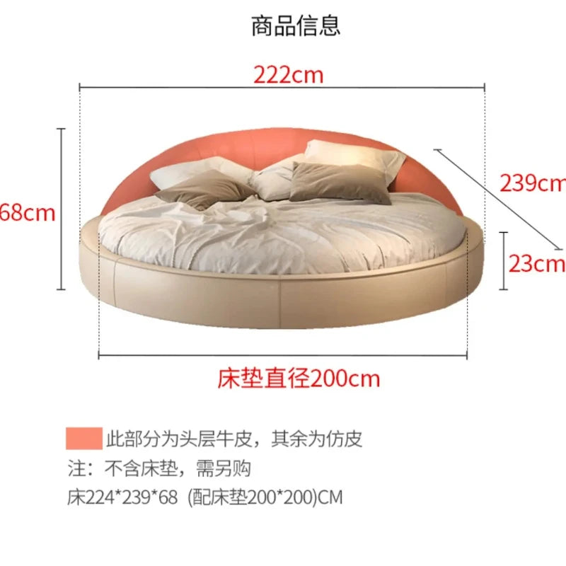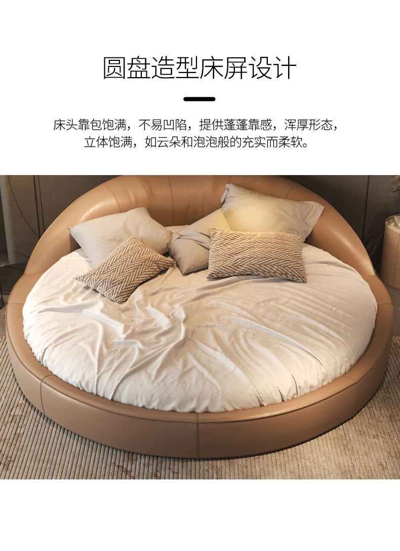 Produktbeskrivning: Skapa ett drömlikt sovrum med denna eleganta runda säng i modern minimalistisk stil. Den krämfärgade designen med prinsesskänsla passar perfekt för bröllopssviter, romantiska sovrum eller exklusiva hem. Den höga densiteten i skumgummit ger en mjuk men stabil känsla – ingen risk för stötar, bara ren komfort.