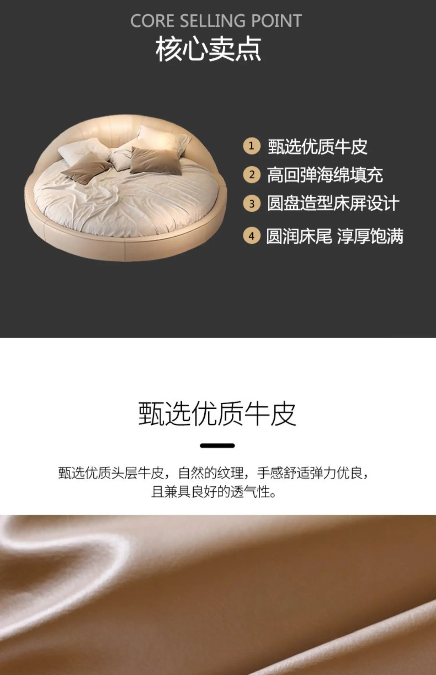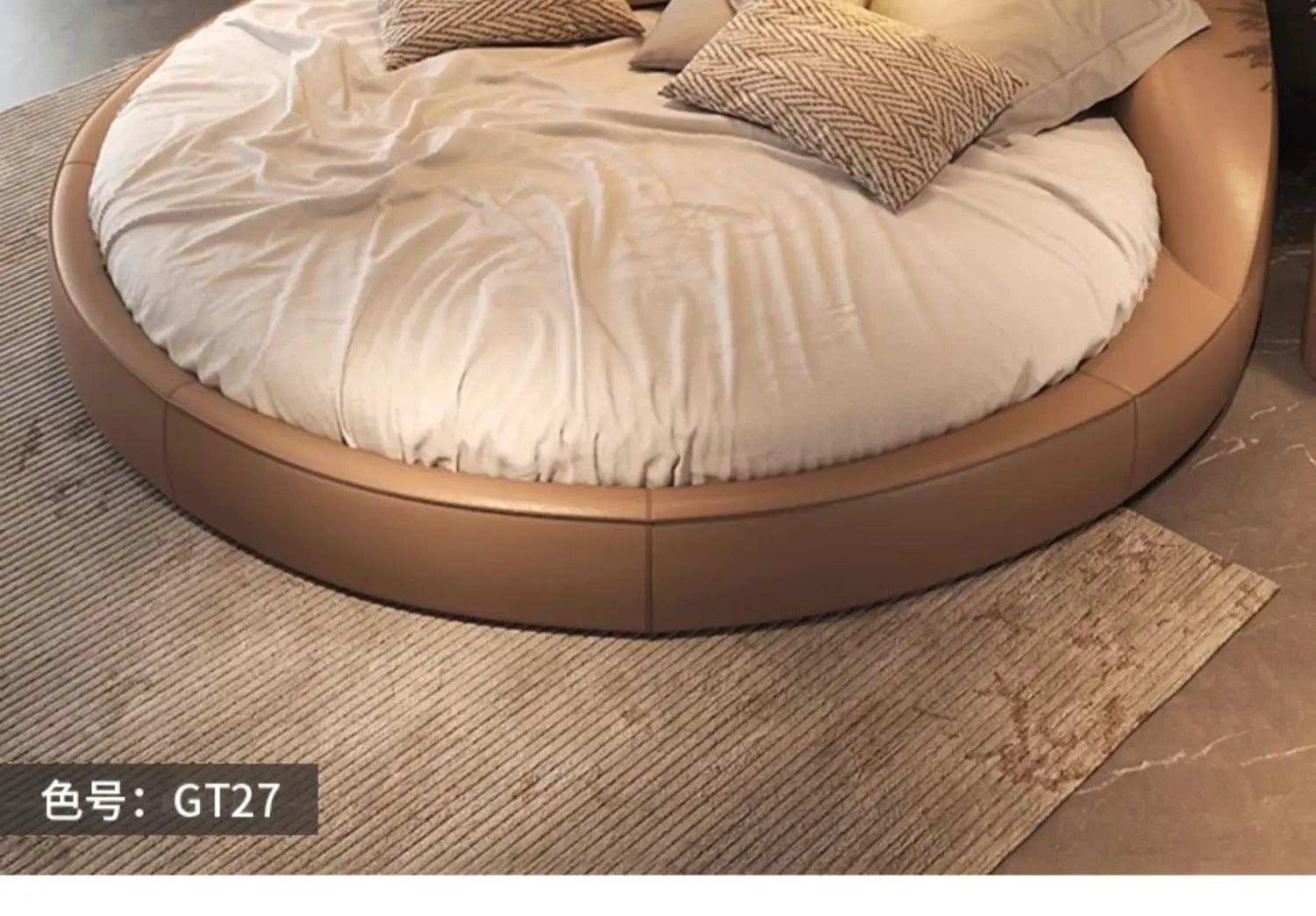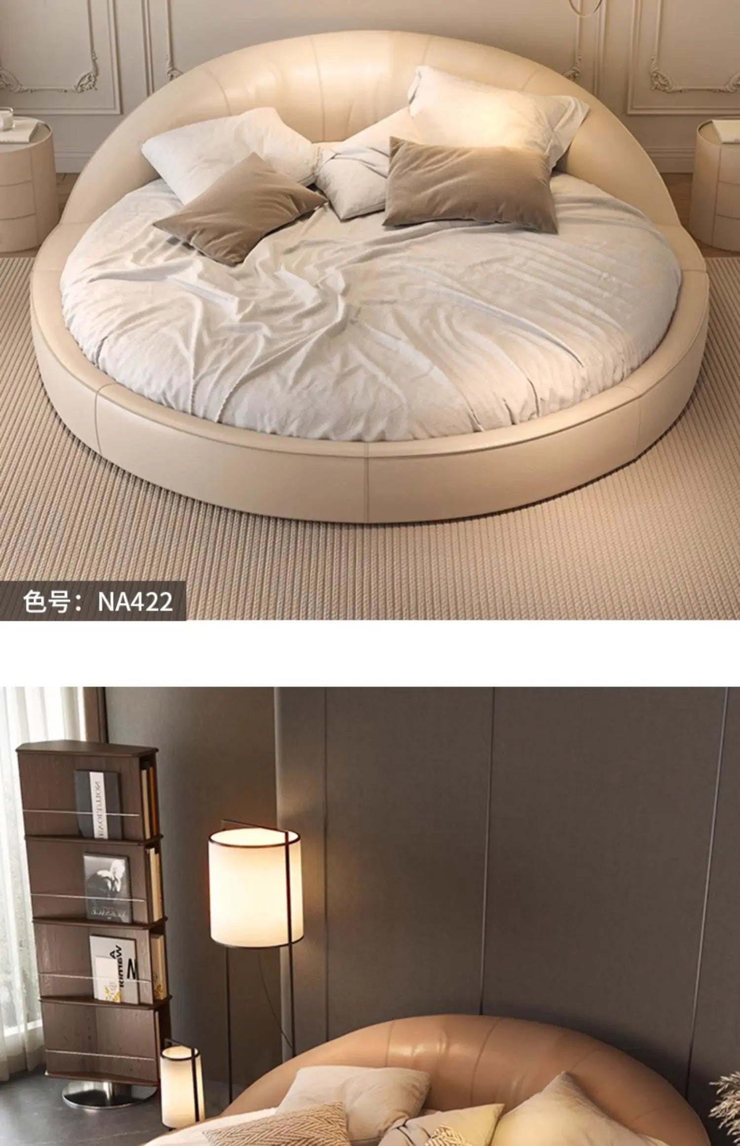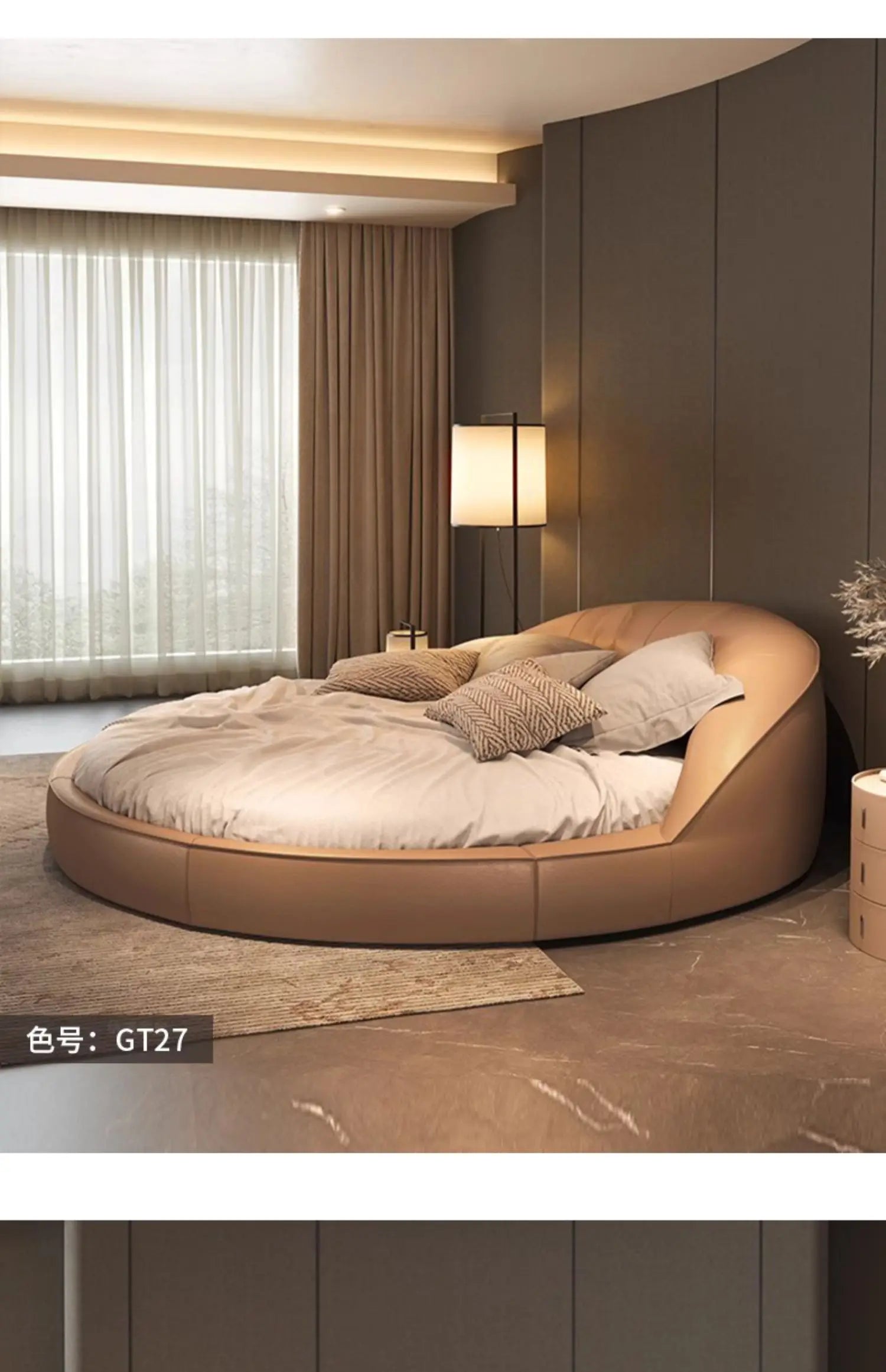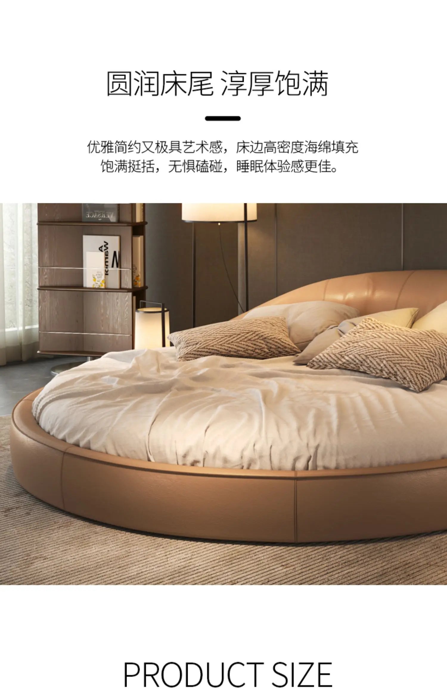 Produktbeskrivning: Skapa ett drömlikt sovrum med denna eleganta runda säng i modern minimalistisk stil. Den krämfärgade designen med prinsesskänsla passar perfekt för bröllopssviter, romantiska sovrum eller exklusiva hem. Den höga densiteten i skumgummit ger en mjuk men stabil känsla – ingen risk för stötar, bara ren komfort.