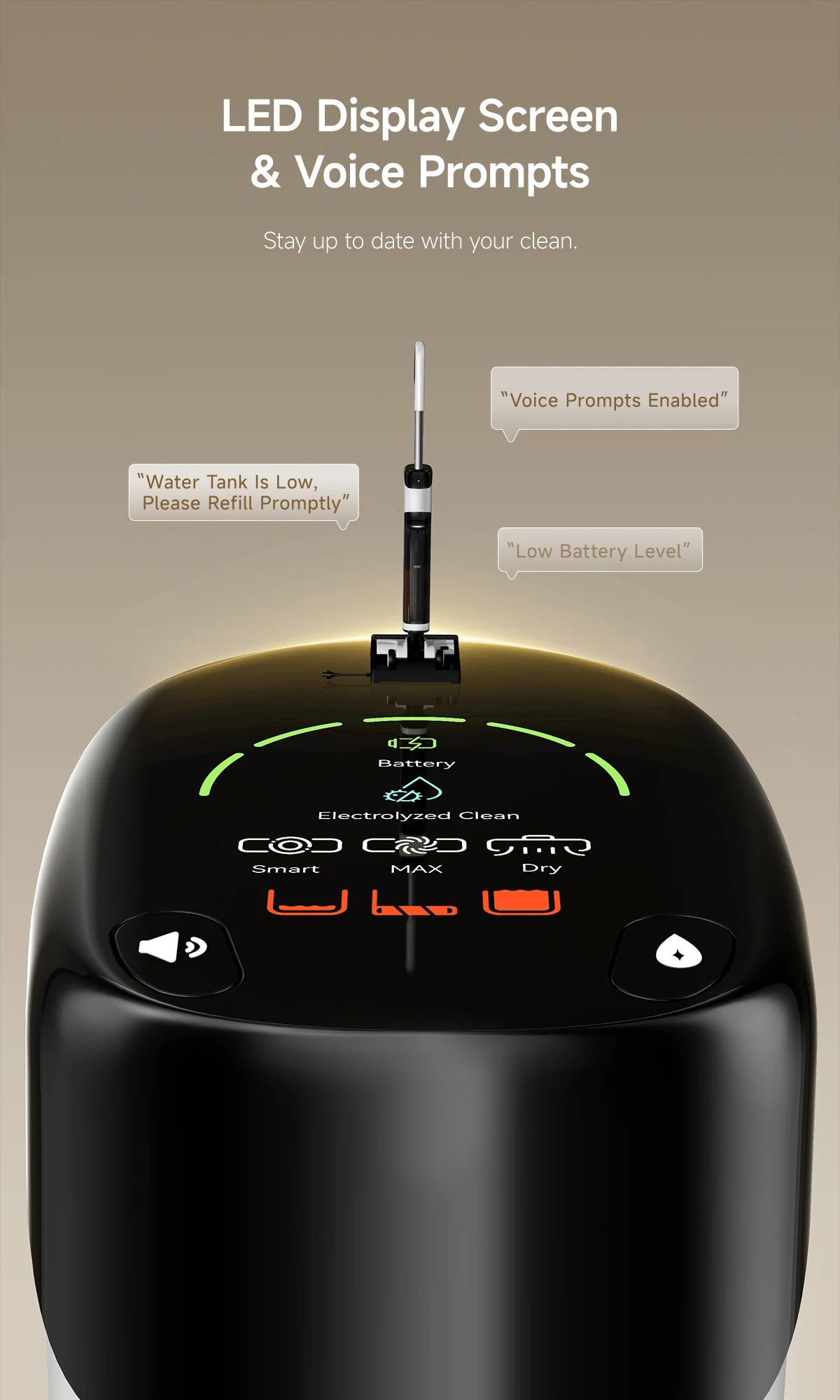 Visar batteri, rengöringsläge, elektroläge m.m. Vid full smutsvattentank får du både ikon på skärmen och röstvarning.