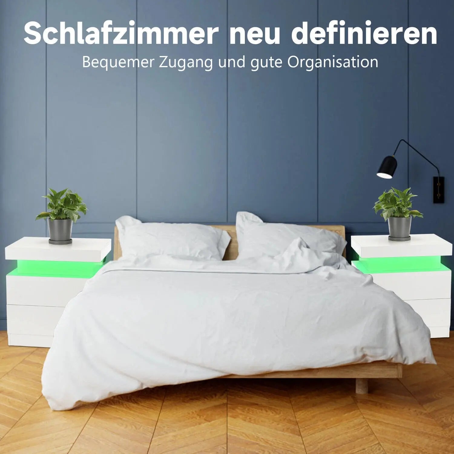 Vitt sängbord med 2 lådor + toppfack – Högglans på alla sidor, RGB LED-belysning, 55 cm