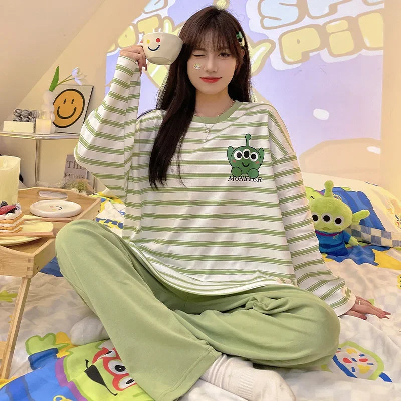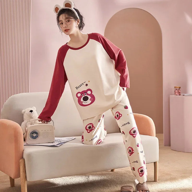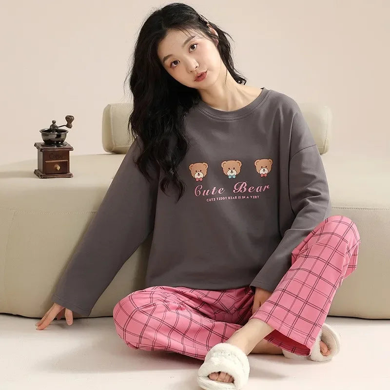 🛌 100% Kammad Bomull Pyjamas för Kvinnor – Höst/Vinter – Söt Tecknad Design – Långärmad & Långbyxor