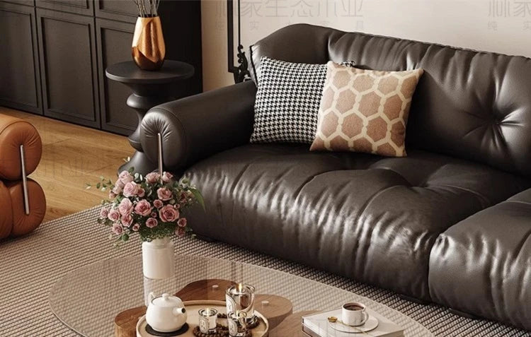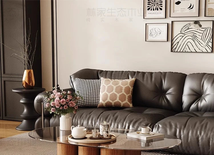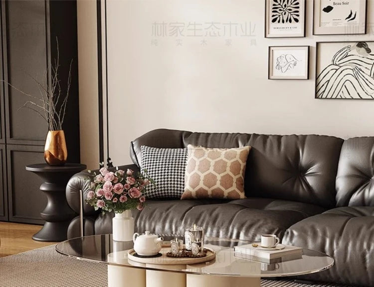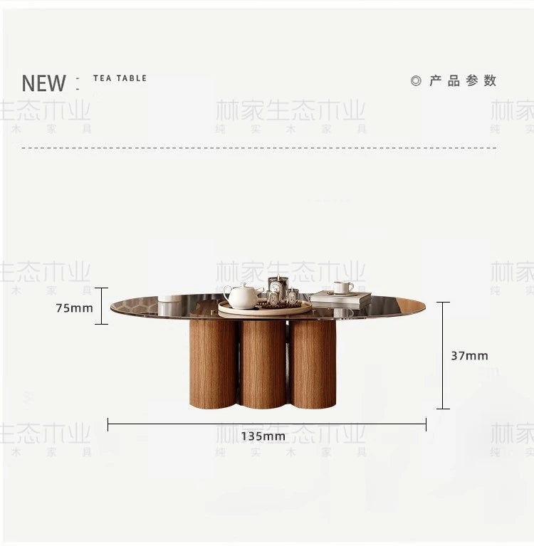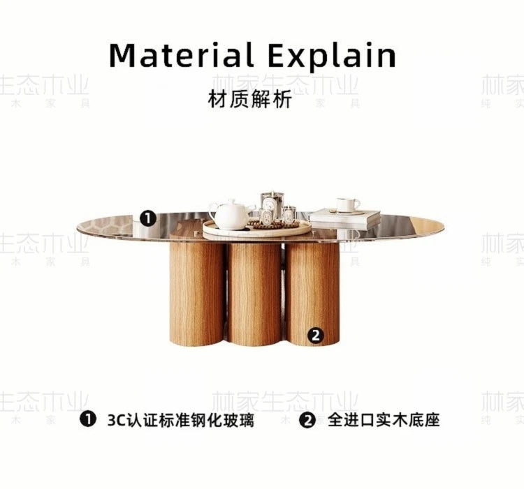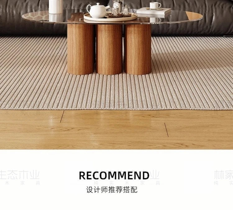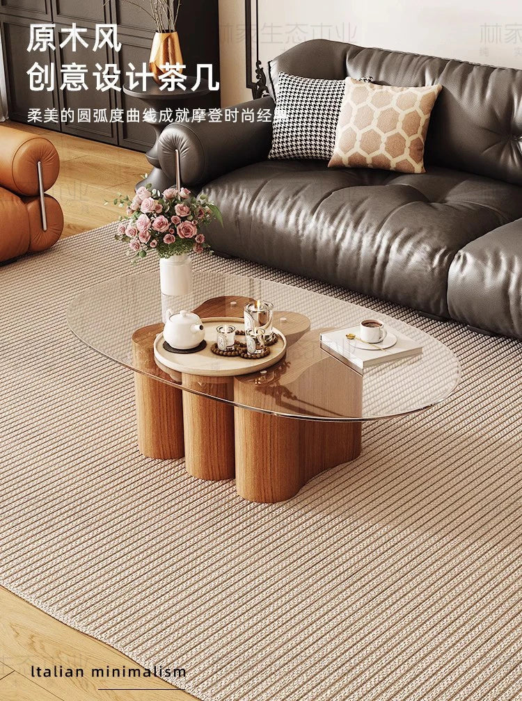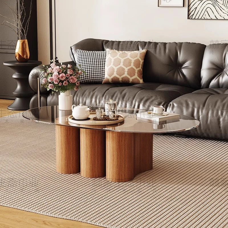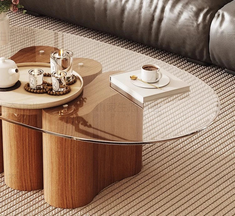 Ett unikt soffbord med oval härdat glas och solid trä – perfekt för vardagsrum, entré eller dekorativ hallmöbel.